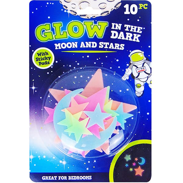 10 Assorted Colour Glow In The Dark Moon & Stars Stickers for Ages 3+