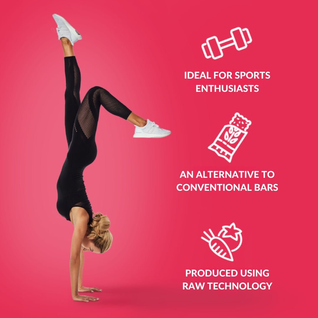 The Energy bar Raspberry dark chocolate cover is a masterful combination of dates, raspberries and almonds with cherry juice in 86% velvety dark chocolate. The product is suitable for vegans.