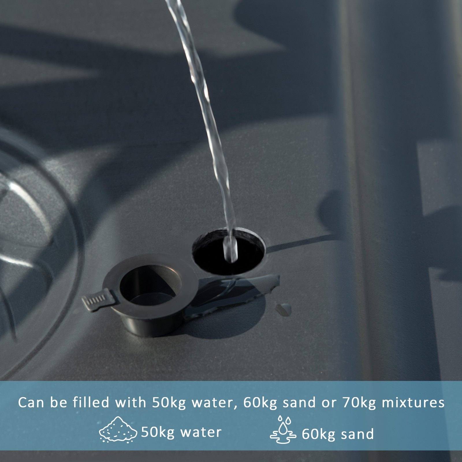 - Base capacity: 50kg water, 60kg sand or maximum 70kg water and sand