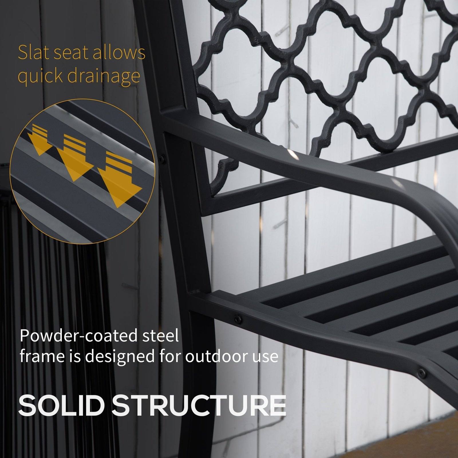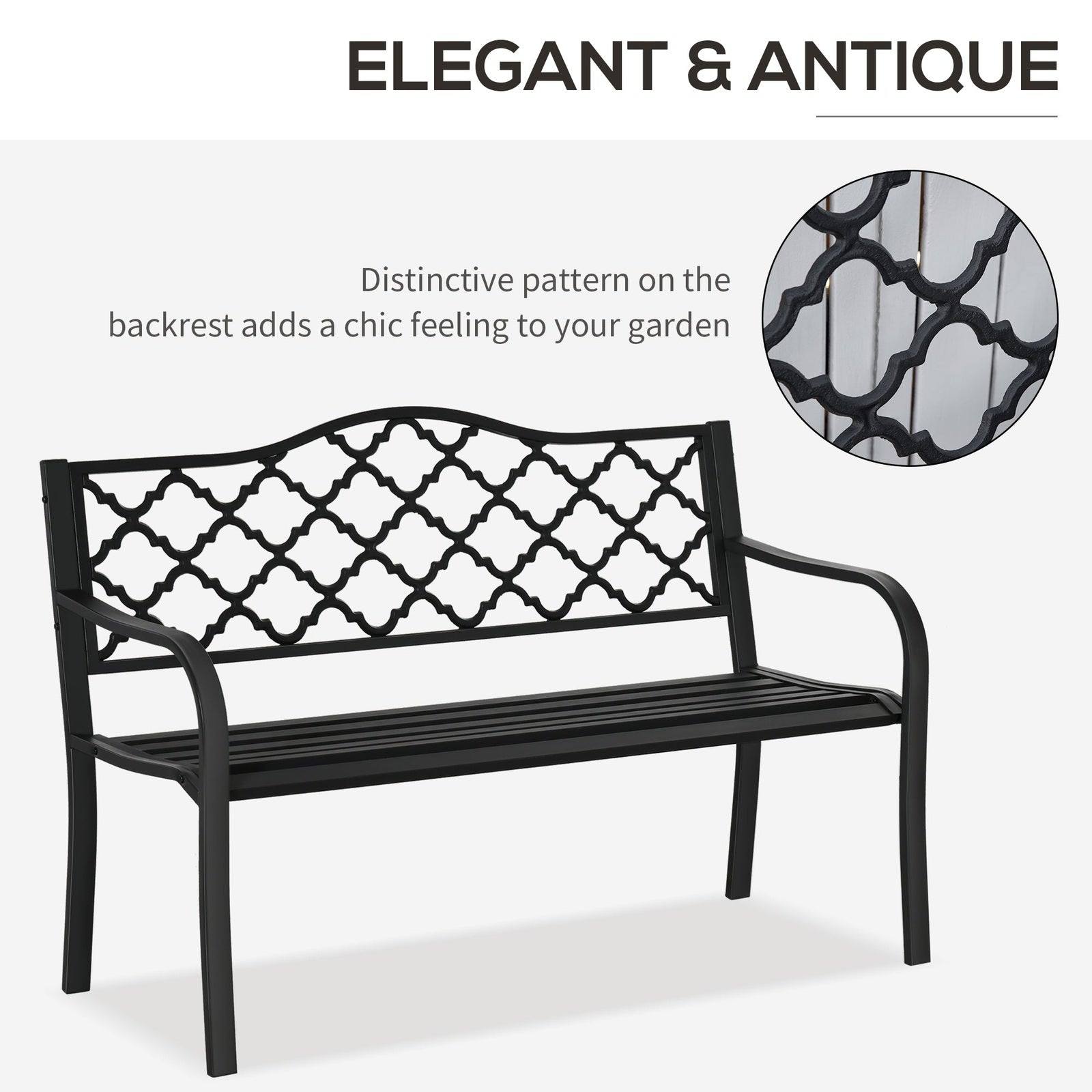 Enjoy a nice afternoon relaxing in your garden, deck, or backyard with this stylish patio bench from Outsunny! Made of durable steel and cast iron, this bench is sturdy yet comfortable enough to sit on. Its chic pattern design on the backrest adds beauty and style that will fit perfectly with any outdoor decor. Add a touch of class to your patio space with this Outsunny vintage outdoor entry bench.