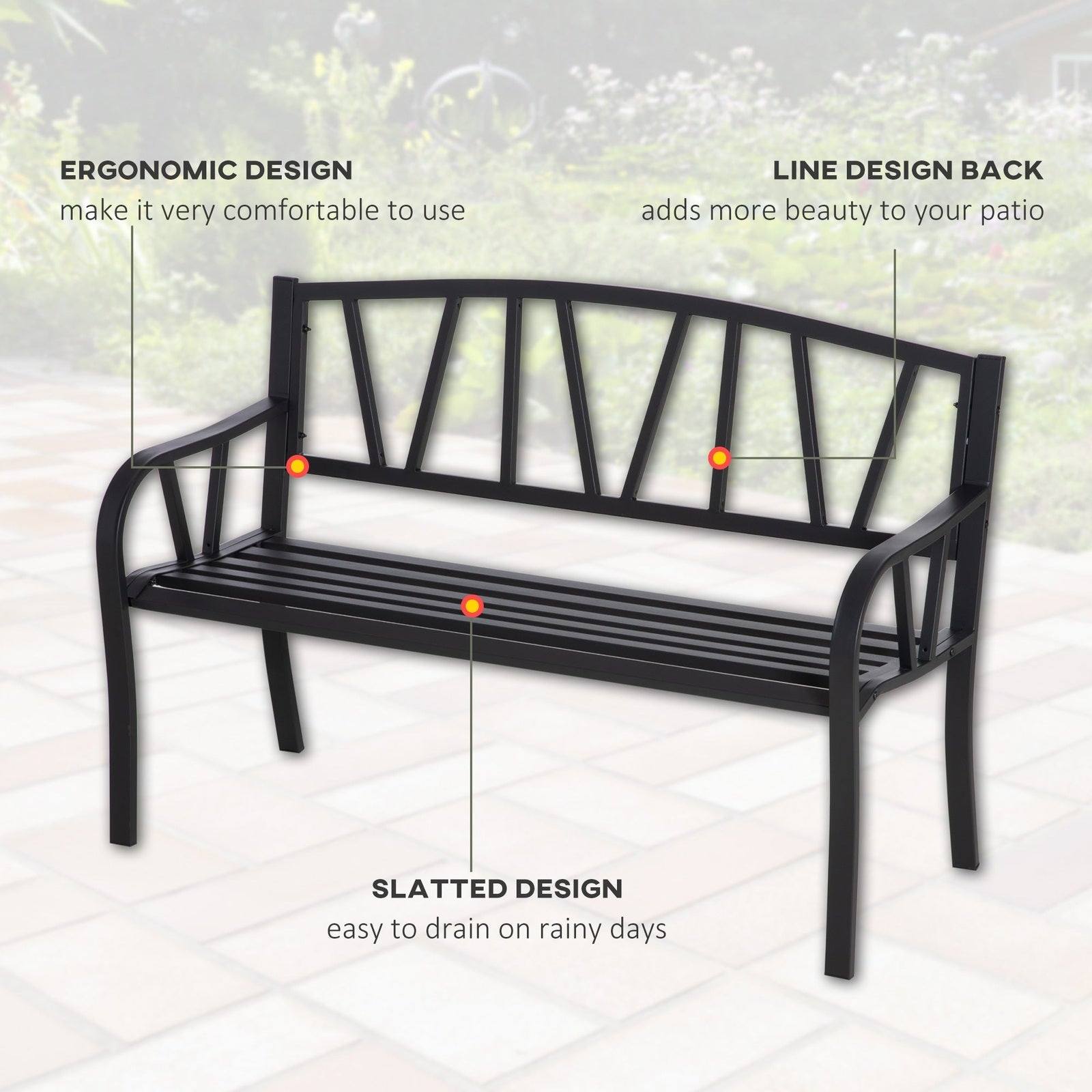 Make your garden complete with this outdoor bench from Outsunny. Made from metal, the structure of the outside bench is sturdy and tough for daily use all-year round. Whilst it's pretty simple to look at, the line design on the back gives the 2 seater garden bench some character so it stands out. Tall back and armrests give your body support as you sit on the garden bench seat. Adding a touch of minimal style into your space has never been easier.