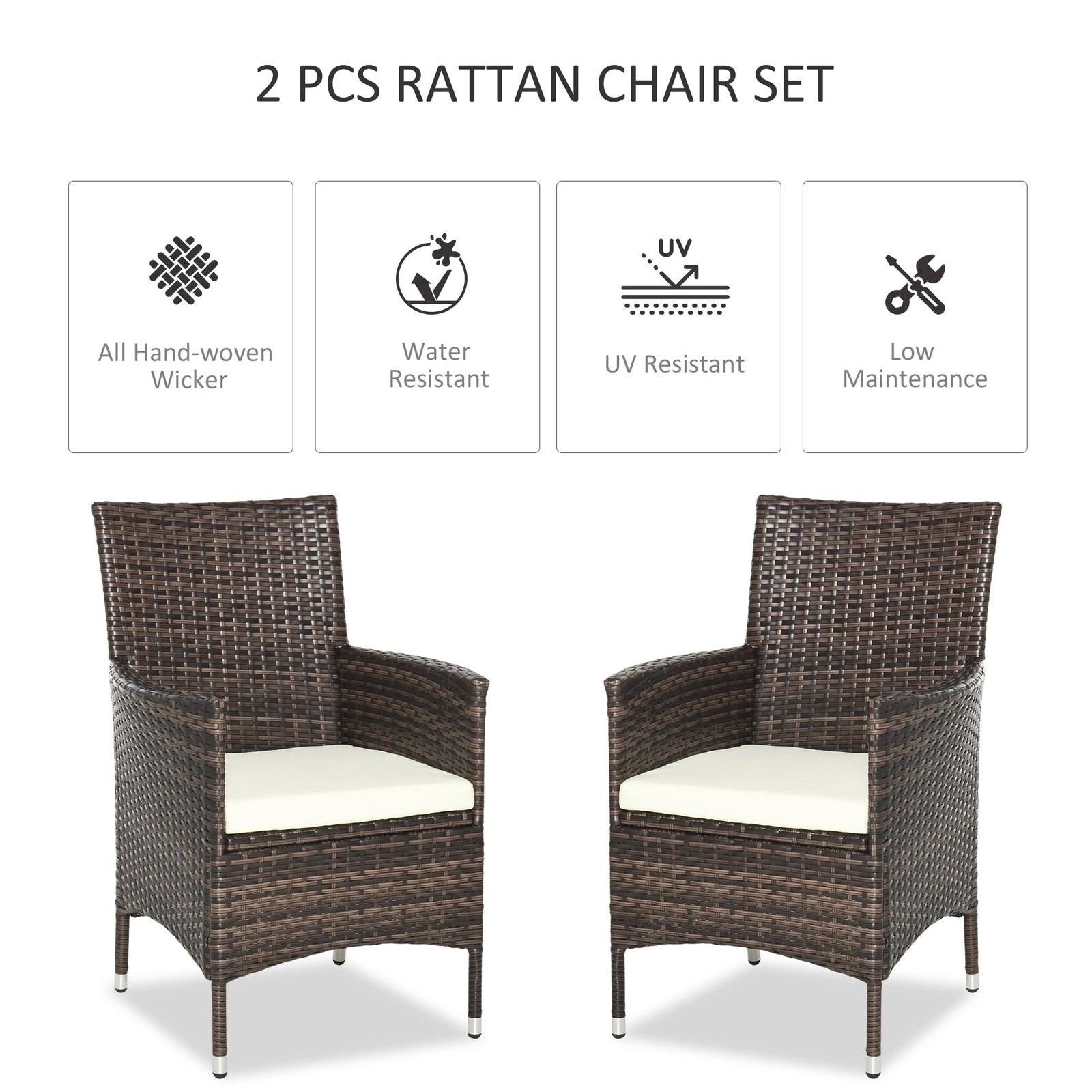 These two Outsunny rattan chairs are a great complement to your outdoors, whether standing alone or matched with other furniture. The chairs are made with a galvanized metal frame for a tough and fully supportive structure, covered with plastic rattan for durability and style. Tall backs and armrests, paired with the cushion mean you can sit in total comfort. Start the season the right way - start it with this stylish two-part set.