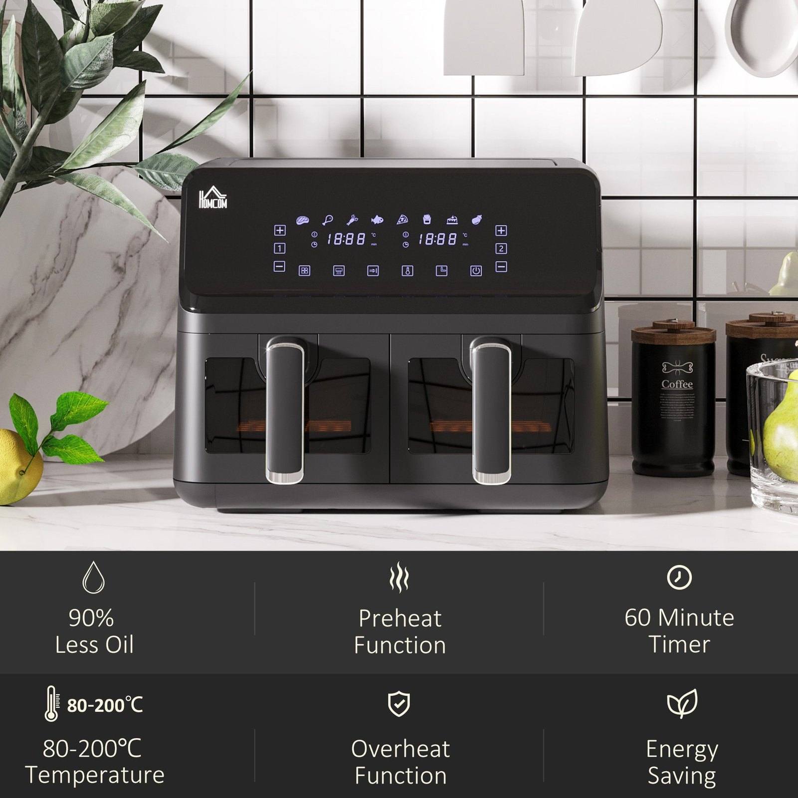 Double the delishness with this HOMCOM twin air fryer. With two separate cooking baskets, which can be individually controlled, you can cook two separate dishes at once - ideal for when you want to cook a full meal; saves time. The 80-200? adjustable temperature means you can cook food at a suitable heat, with a 60-minute timer to cook to the time you want without having to overlook it constantly. Comes with a cool-touch handle and overheat protection for safety.