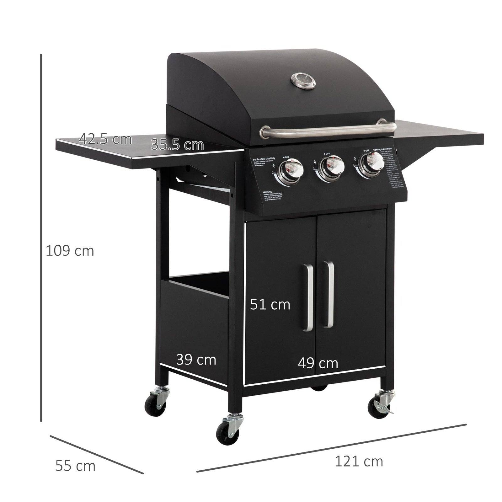 The delicious taste of summer is impeccably close with this Outsunny gas BBQ. There are three burners to create individual cooking zones - easy to cook a variety of food; paired with the large grill, it's suitable for hosting big BBQs. Each burner can be turned on easily with the piezo ignition. Unit features two side shelves, top warming rack and bottom cabinet - plenty of room. Pull the lid down when cooking for a smoked effect - finished with a thermometer to see the inner temperature.