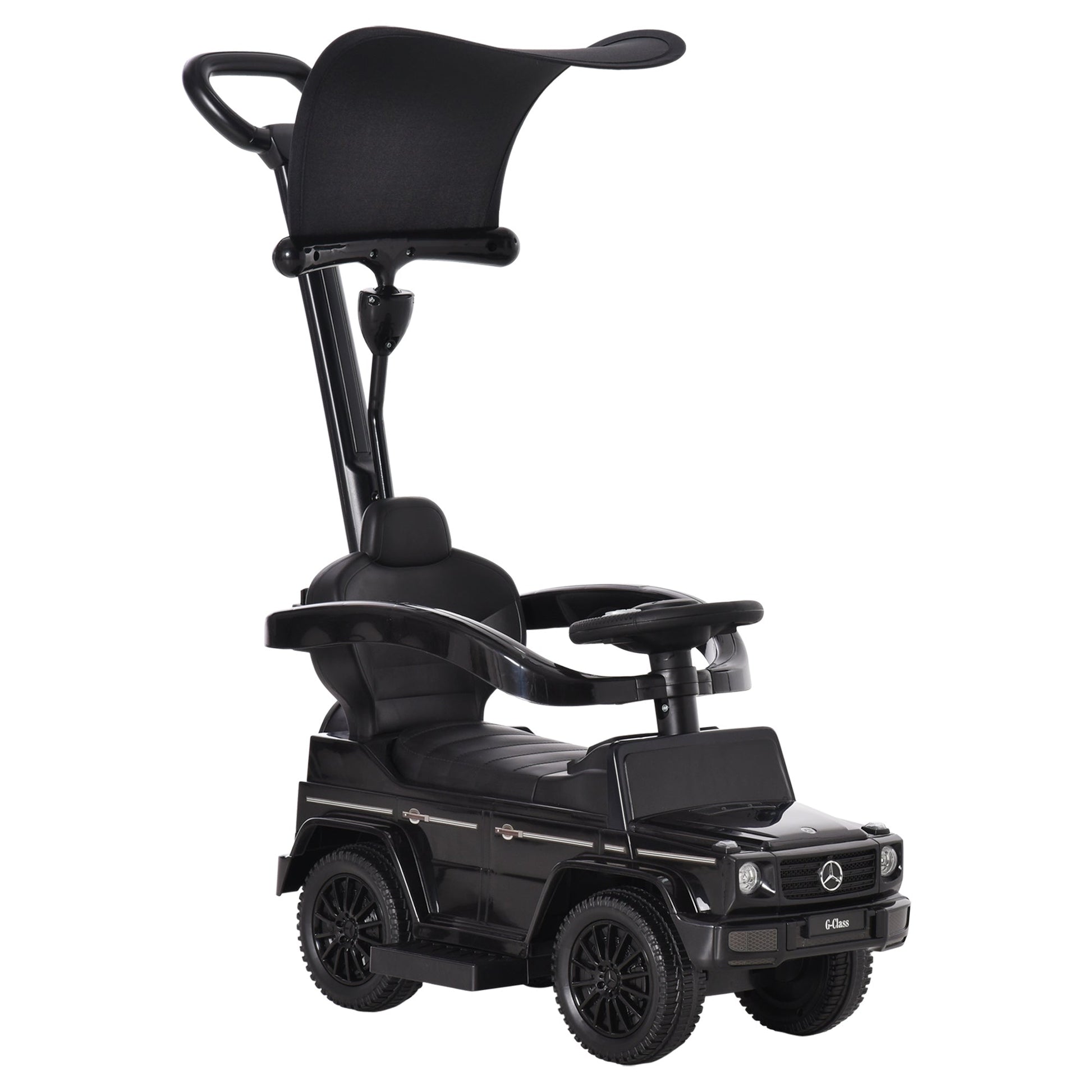 Your search for a fun sliding car stops here. Give children aged between 12-36 months this impressive piece from HOMCOM. Officially licensed Mercedes design adds to the extra fun. Features a moving steering wheel and horn. The seat with backrest is comfortable supportive, with the outer guardrail ensuring safety. Comes complete with a top canopy so they don't get burnt by the sun whilst cruising outdoors. 3-in-1 design: a walker, slider and push ride-on.