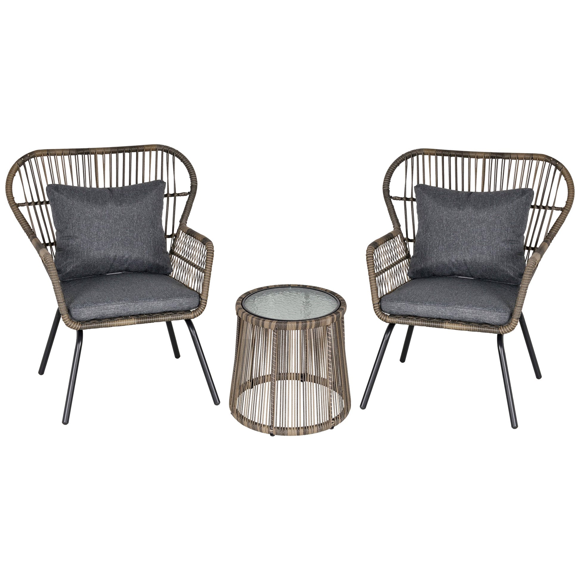 A traditional garden set gets a modern update with this seating set from Outsunny. Here we see the two chairs formed into a wing shape, where steel forms the frame and is wrapped in PE wicker in a webbed design - a look which is elegant and stands out beautifully. Each chair comes with a back and seat cushion for comfort, and the round table, in the same design, is fitted with a glass top for long-term use. Making a statement this season has never looked so good.