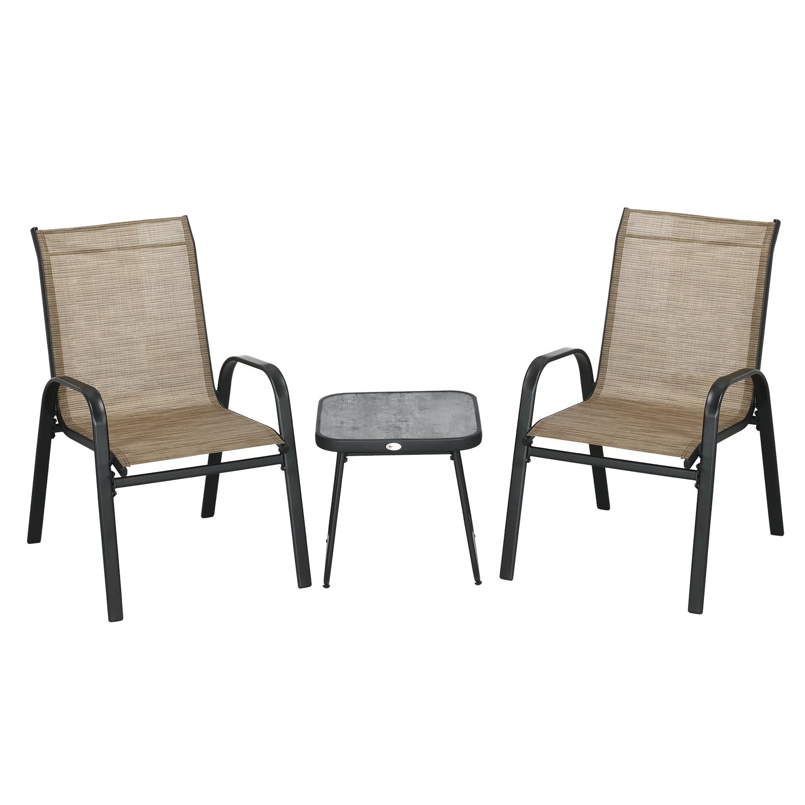 This Outsunny three-piece set is great for relaxing with company outdoors. Comes with two chairs and table. Each piece has a steel frame: strong and supportive. A great addition for all outdoor spaces.