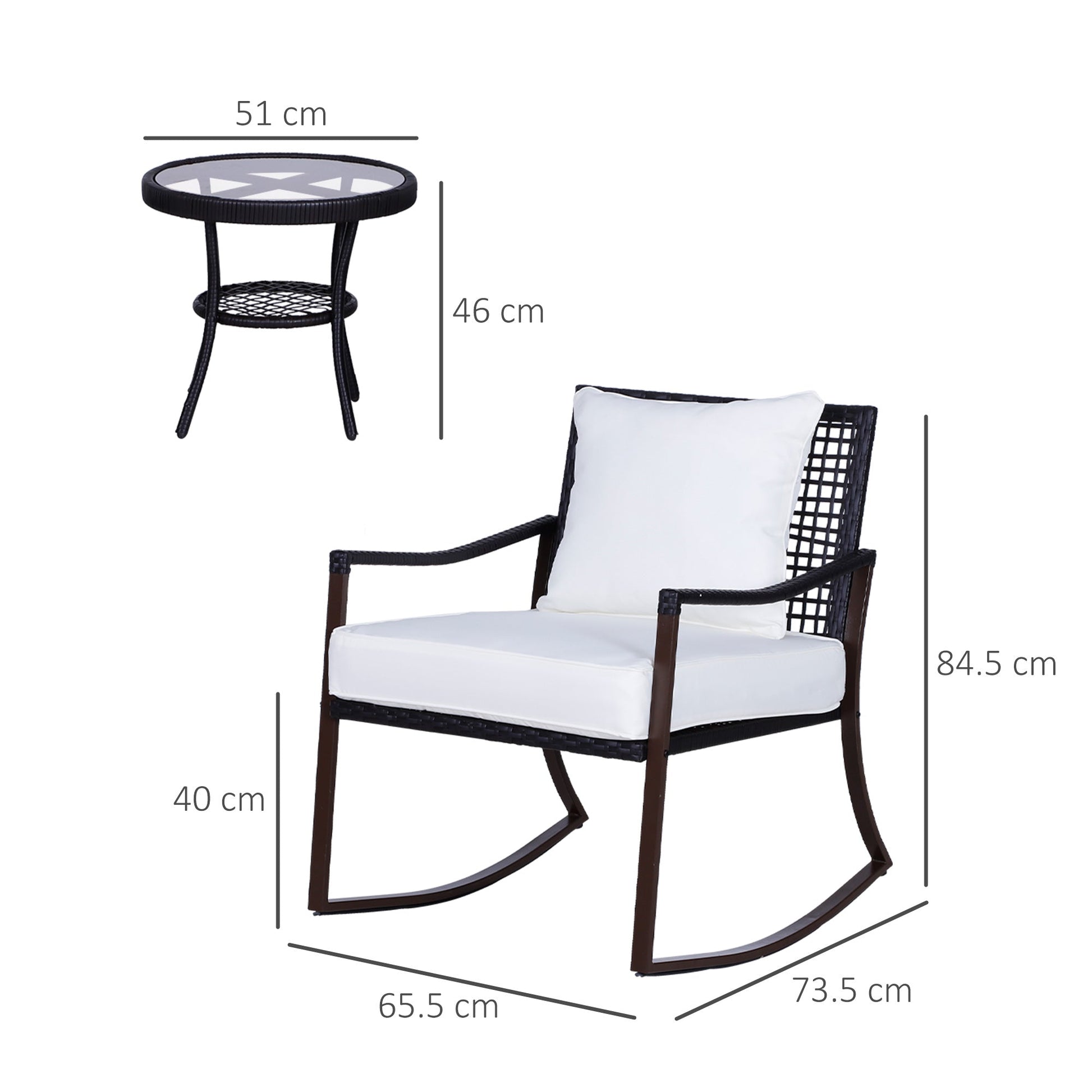 This Outsunny rocking chair set is an ideal addition to your outdoor garden patio. The set consists of 2 rocking chairs and a coffee table with tempered glass. Made from a steel frame and covered with PE rattan to match any indoor or outdoor décor. The set comes complete with 8cm padded cushions for your comfort. Kick back, relax, and enjoy the smooth rocking glide while indulging yourself in your outdoor space.