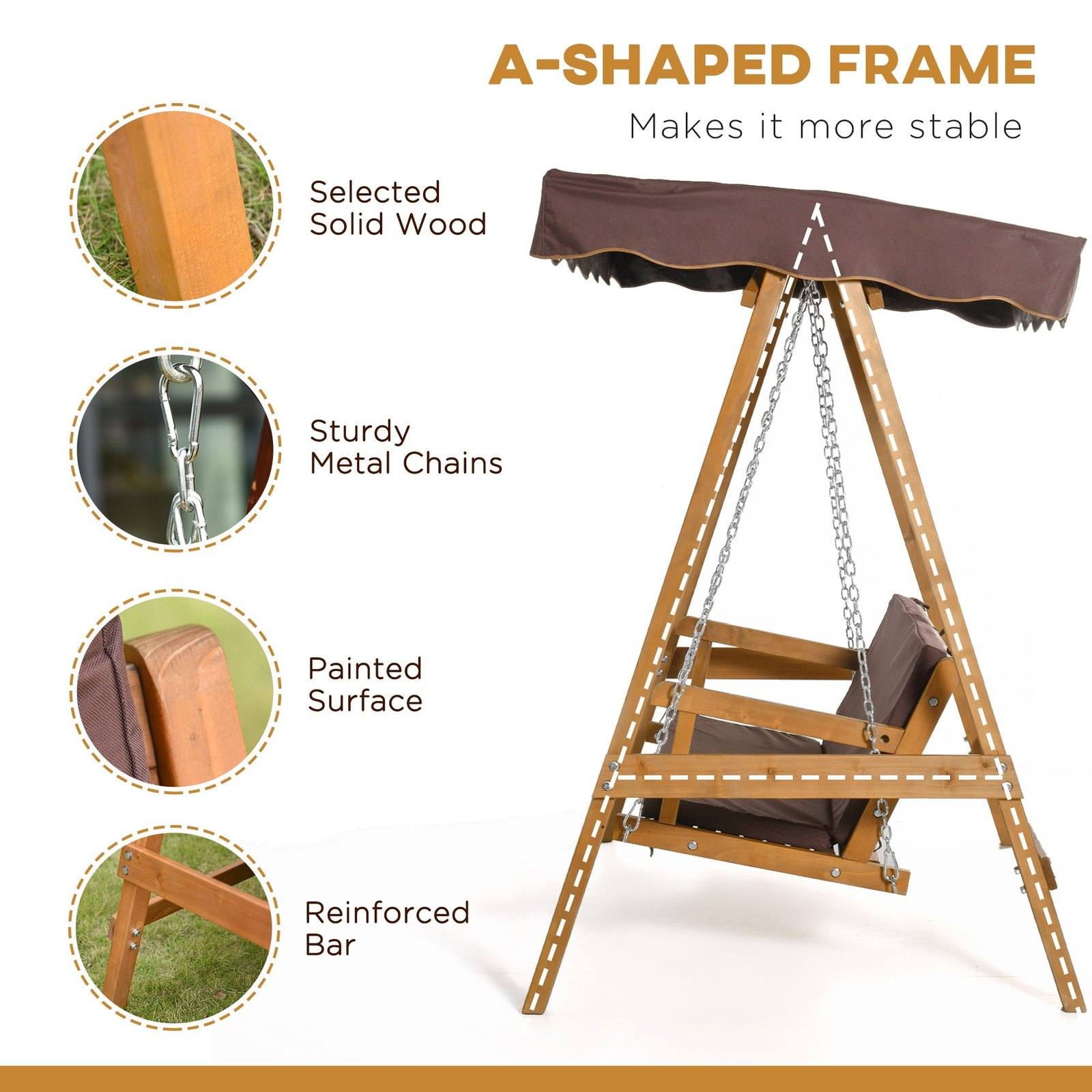 Create the perfect place in your garden with garden swings for adults from Outsunny. Made from solid fir wood, the 3 seater garden swing structure is solid and tough and the painted surface helps protect the wood. Three-seater sized, the wooden swing provides plenty of room to relax with friends or even by yourself, with padded seats and back cushions for comfort and an overhead oxford canopy to protect you against mild wind and water as you sit below. A spot youll find hard to leave.