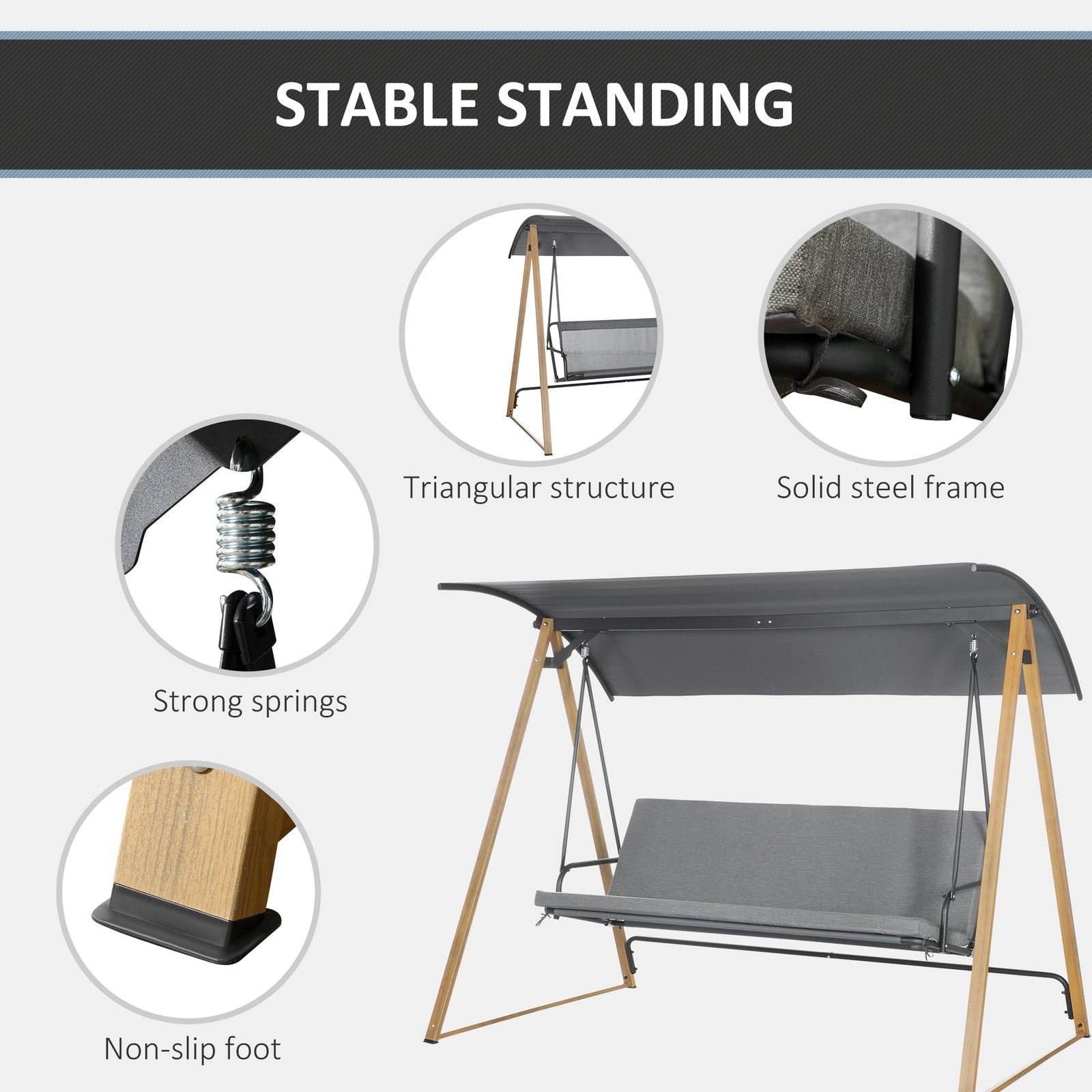 Rest outdoors with Outsunny swinging garden chair. Seat holds up to three people - plenty of room to sit with the company or grab lots of room to yourself. The adjustable 30° angle canopy shields you from sun glare and light weather. The swinging chair's steel frame means a strong structure, with non-slip foot pads to complete.