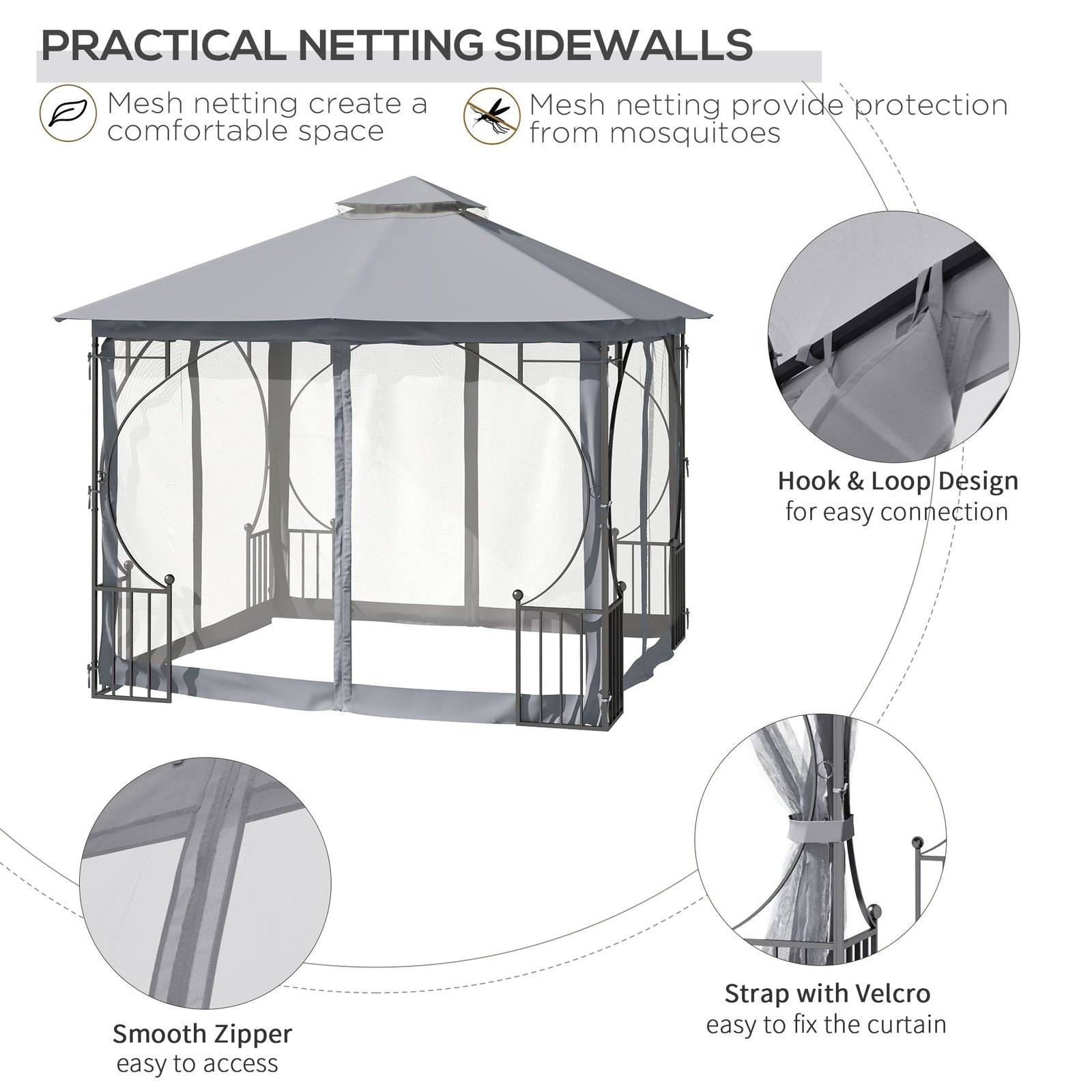 3 x 3M Garden Gazebo Patio Party Tent Shelter Outdoor Canopy Double Tier Sun Shade Metal Frame Netting Light Grey