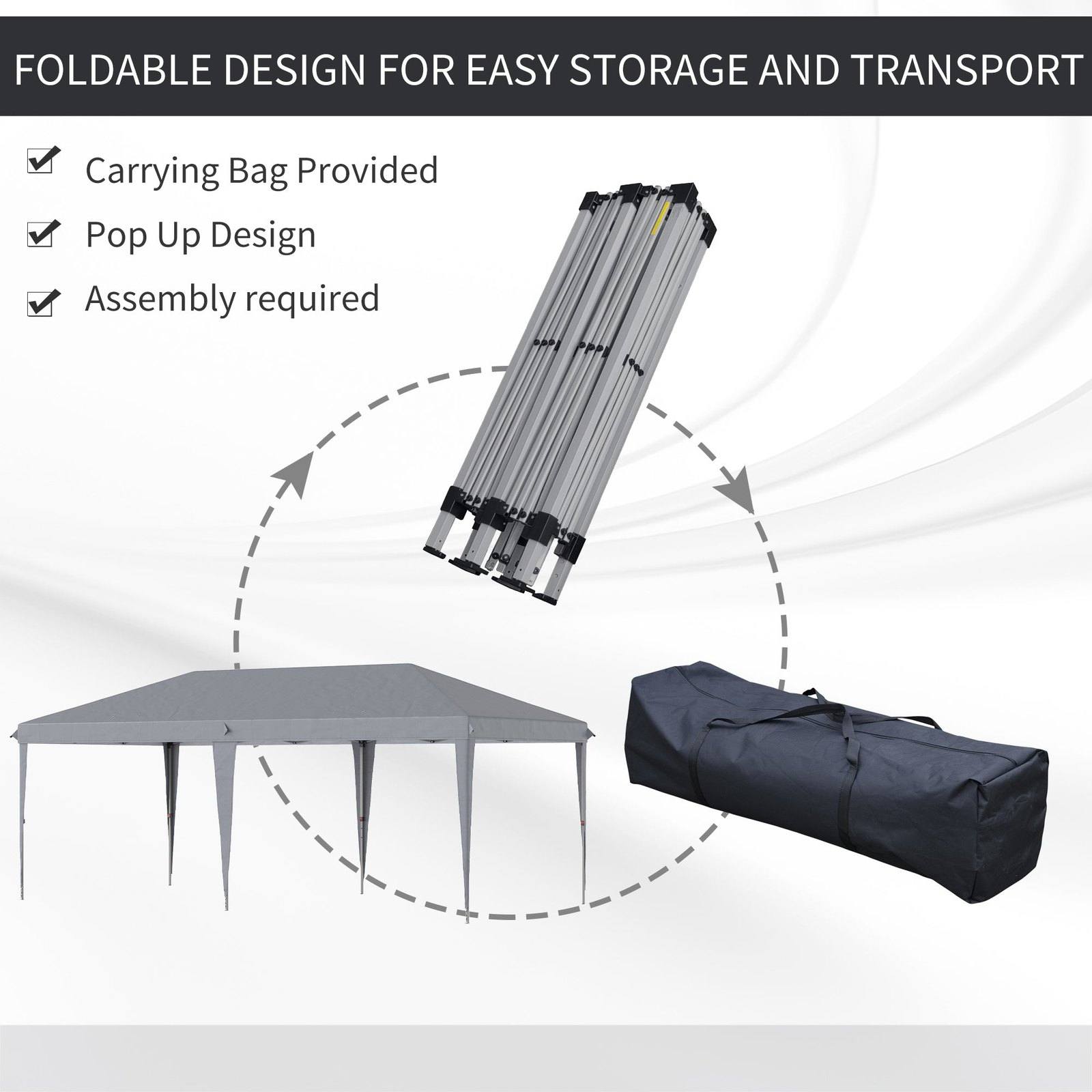 This Outsunny 6m x 3m pop up gazebo is a great way to create a shaded place when you require it. The garden shelter is made up of a powder-coated steel frame with a 210D Oxford cloth canopy cover. A foldable and easy-assembly design, it's perfect for temporary use: think for your outdoor gatherings - like garden parties, BBQs, receptions, car boot sales and more. Comes with ground pegs and guy ropes to secure to the ground for extra stability. Comes complete with a handy carry bag.