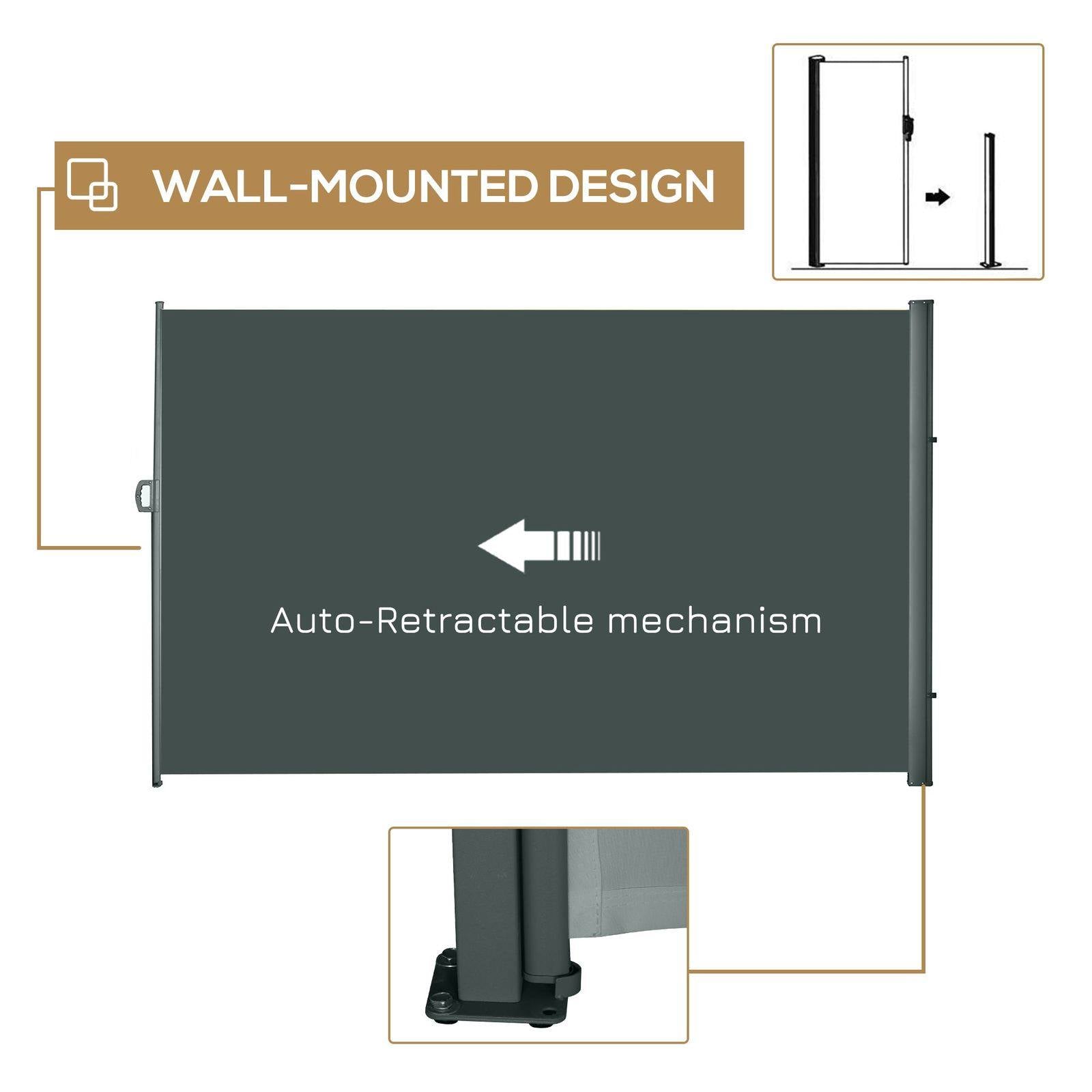 Prevent glaring sun and gusting winds disturbing you outdoors with this retractable screen from Outsunny. The metal base frame is tough to ensure it is a lasting addition in your garden, with it attaching securely and easily to cement or solid wood for quick set up. The free standing awning is made from polyester with PA coating for weather-resistance, with it pulling out smoothly and fixating in place with the clip lock handle a simple operation. A great way to enjoyably extend your time out in the garden.