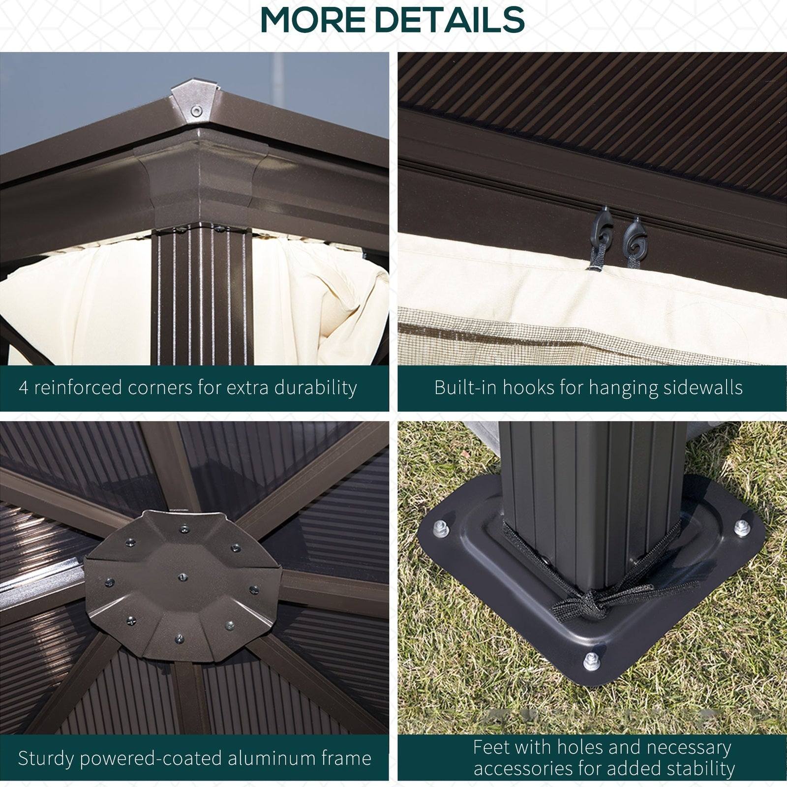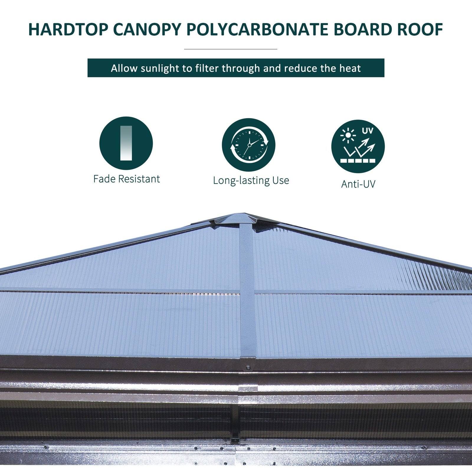 Add an elegant touch to any outdoor space with this Outsunny 3m x 3m gazebo with netting, a perfect sun shelter for any occasion! The polycarbonate roof is UV protection. Rust resistant aluminium for the frame makes it sturdy, formed into a spacious size - you can host plenty of people at once. Curtains create privacy, each with inner netting to shield you from annoying bugs and more. Life is meant to be enjoyed outdoors, so enjoy this hard roof gazebo in your own backyard space.