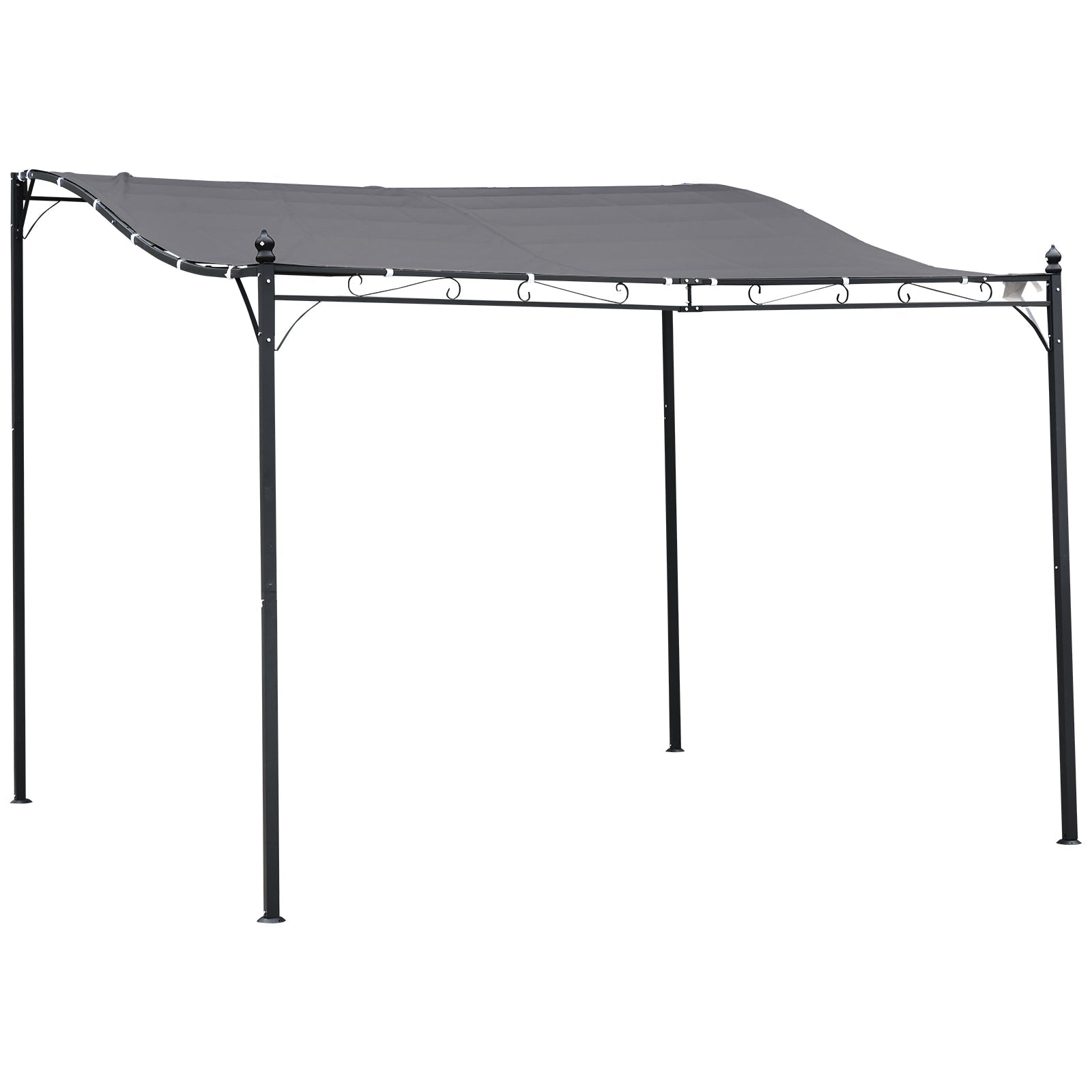 Give yourself a spot to take shade and shelter outdoors with this pergola-style gazebo from Outsunny. Using powder-coated metal to form a frame which is tough and resistant, it is crafted into a 250 x 297cm design, consisting of a taller back and short front, with a waved connecting frame covered with a top 180gsm polyester canopy, providing shelter against UV rays and light wind and rain. With an elegant scroll design on the front, its finished with four drainage holes on the top to prevent water build up, and comes with eight ground stakes to pin to the ground.