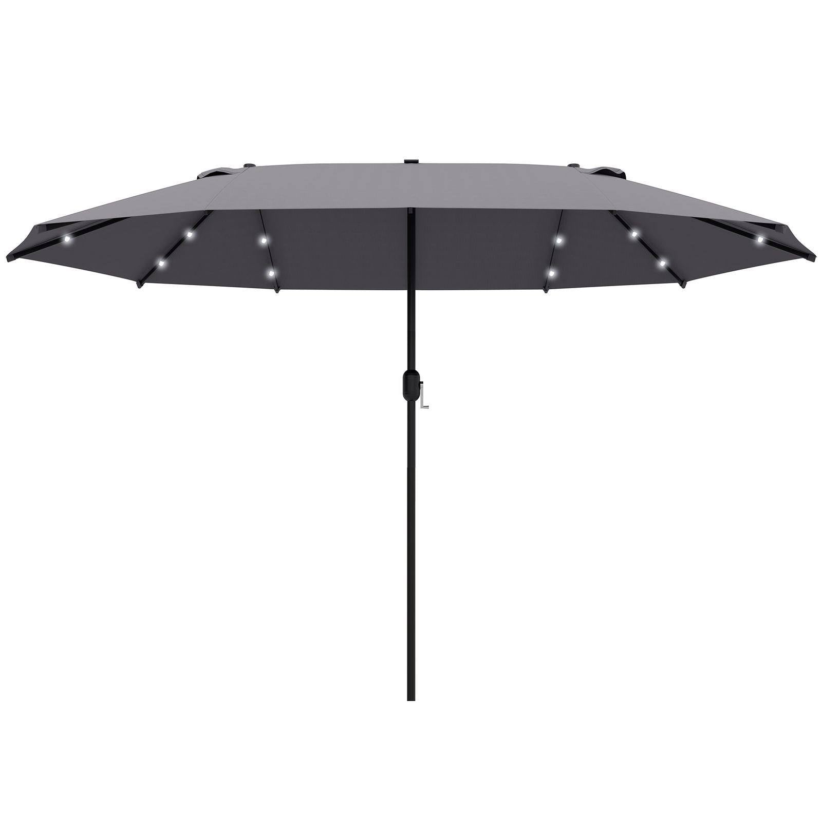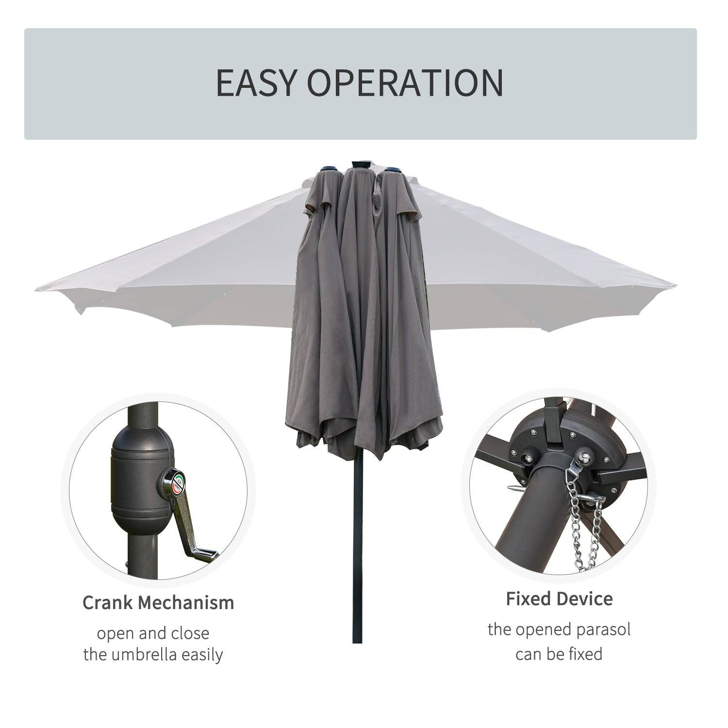 It's time for your garden to shine with this double-sided parasol from Outsunny. A stylish design, the parasol umbrella features 36 lights on the frame ribs to light up your outdoor seating when dark. The large double parasol garden creates plenty of shade, protecting you from direct sunlight. Using a crank mechanism for effortless opening and closing. If you've been searching for a new way to change your garden, then this garden umbrella is the answer. Matching base: Outsunny sku 84D-089.\n