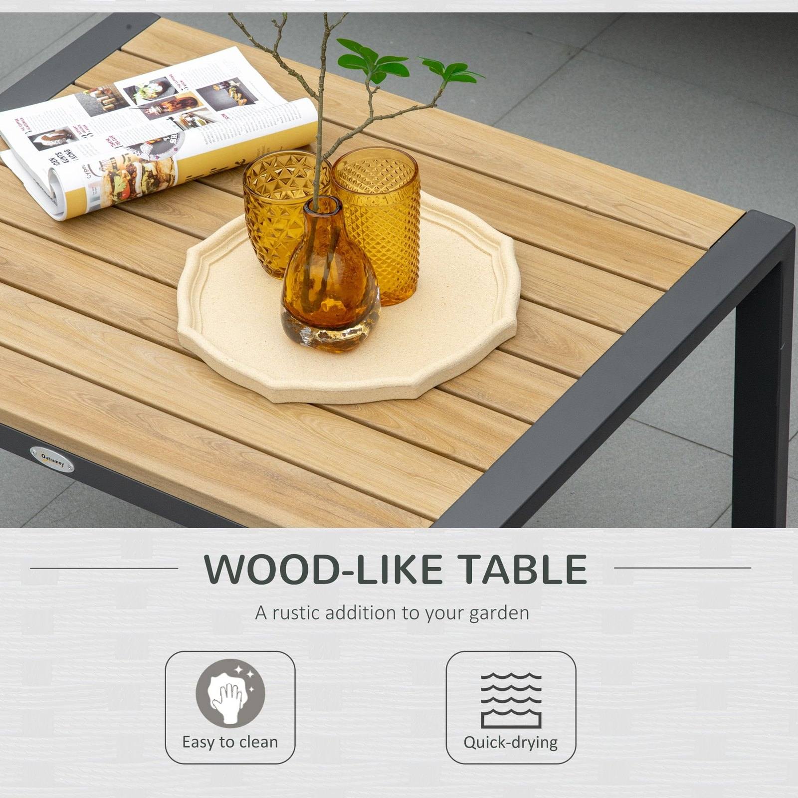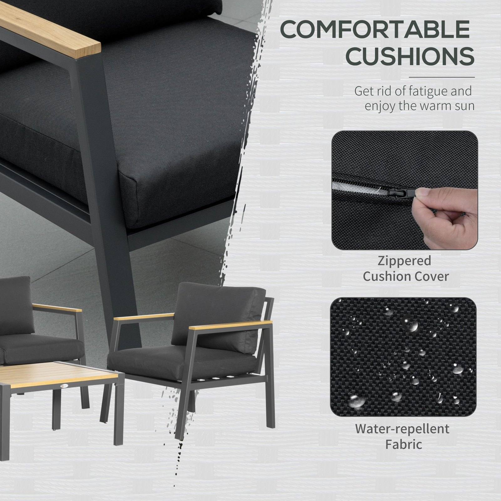 Keep your garden dining simple - with comfort at the forefront with our aluminium garden furniture sets from Outsunny. The patio set comes with two armchairs, a loveseat and small table. Each frame is made from powder coated aluminium for strength, with seat and back cushions on all seats for you to sit comfortably. The high back and armrests of the seats support your body. Metal garden furniture set is also completed with wood-effect slats on the table and armrests for a touch of natural beauty.