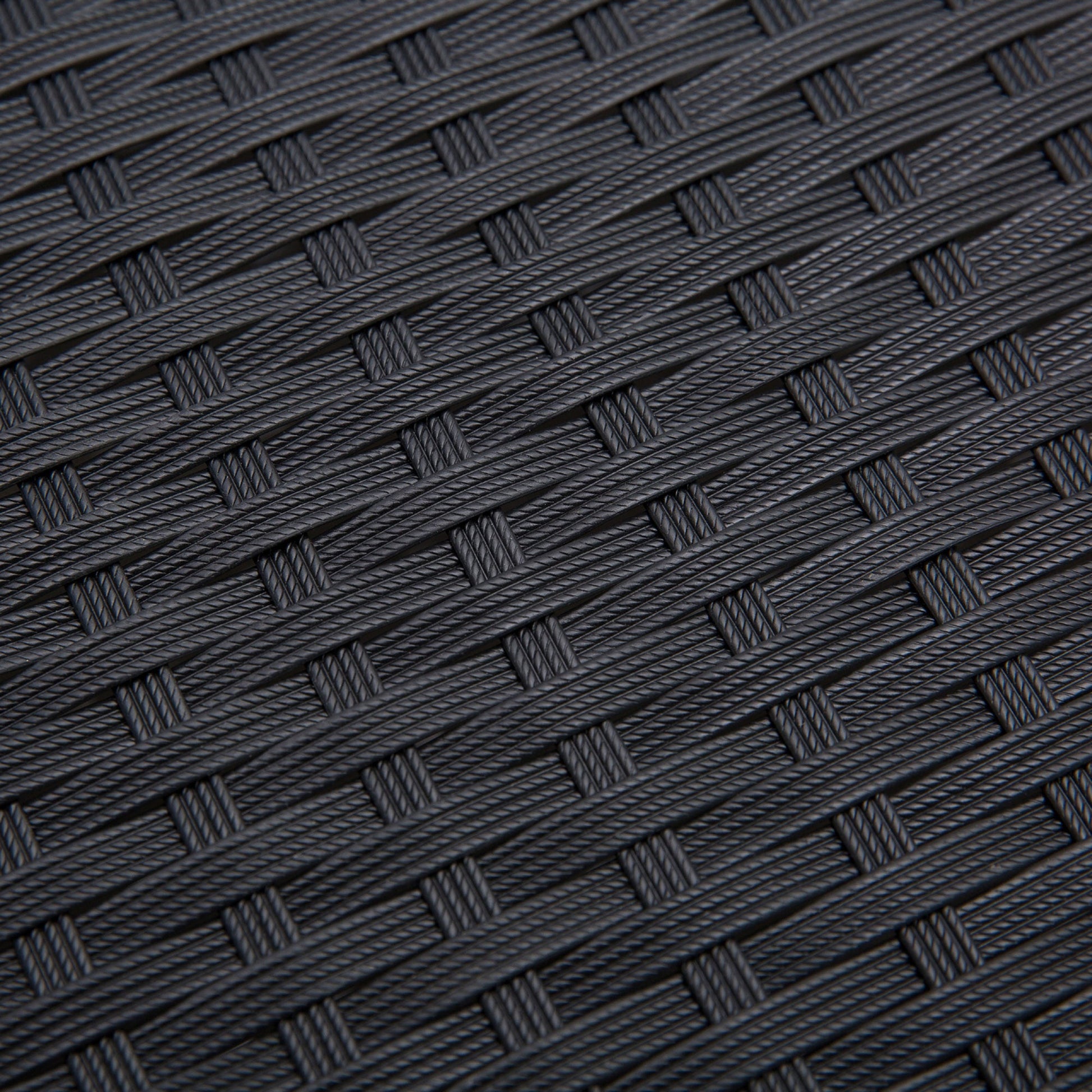 - includes two wide chairs, a two-seat sofa and large coffee table Matte black metal frame with dark grey PE rattan panels, a muted and stripped back look