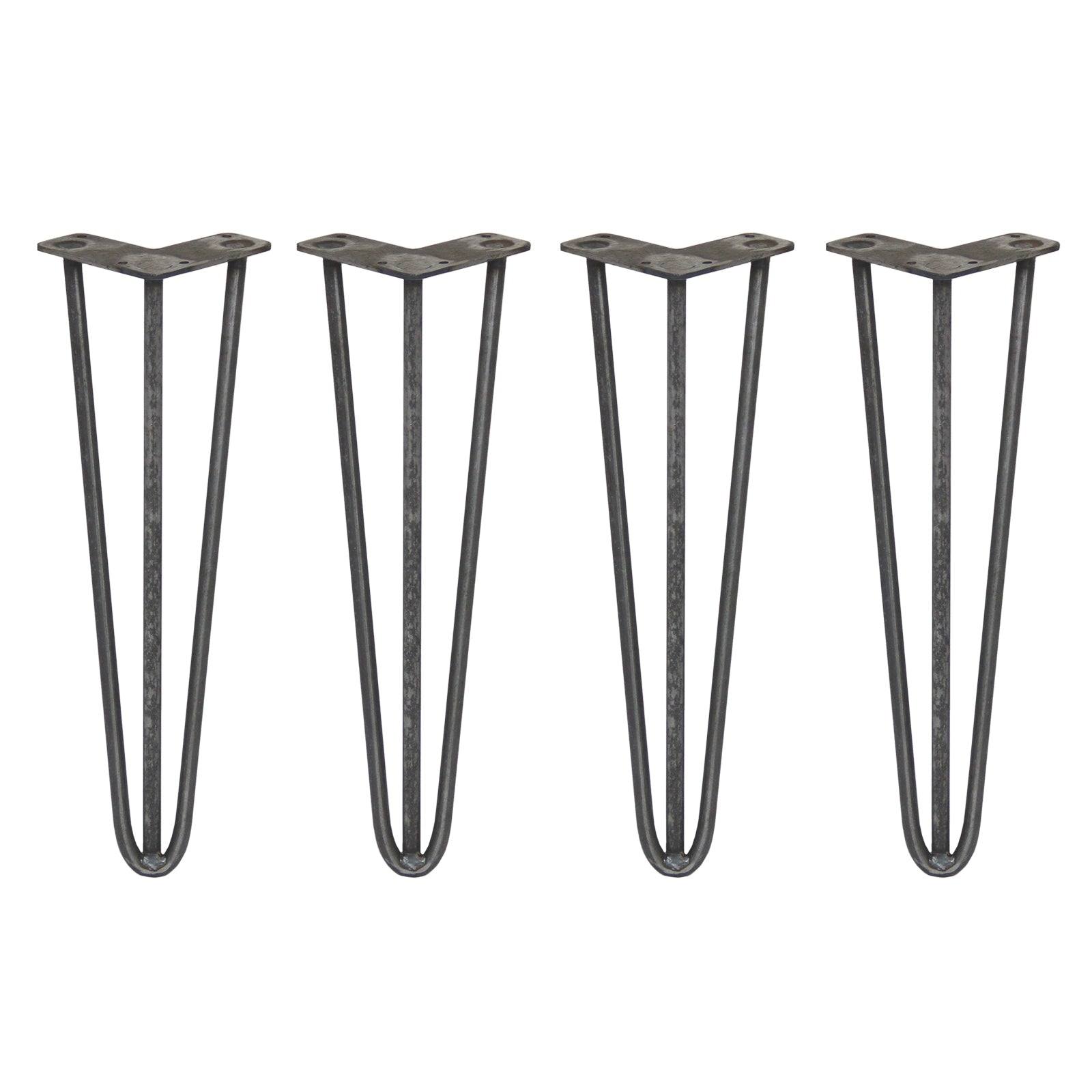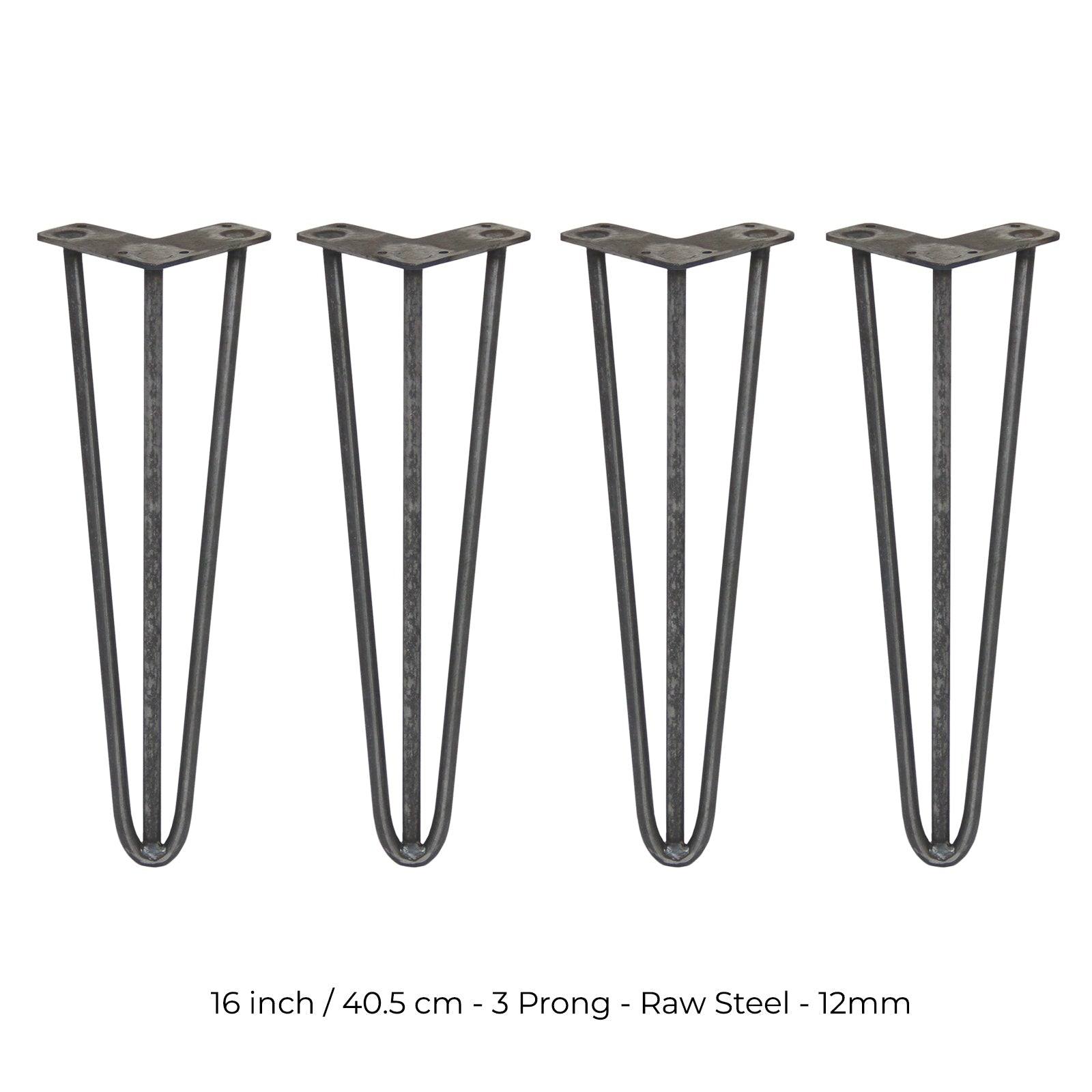 4 x 16" Hairpin Legs - 3 Prong - 12mm - Raw Steel