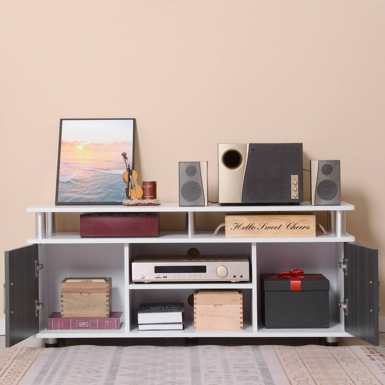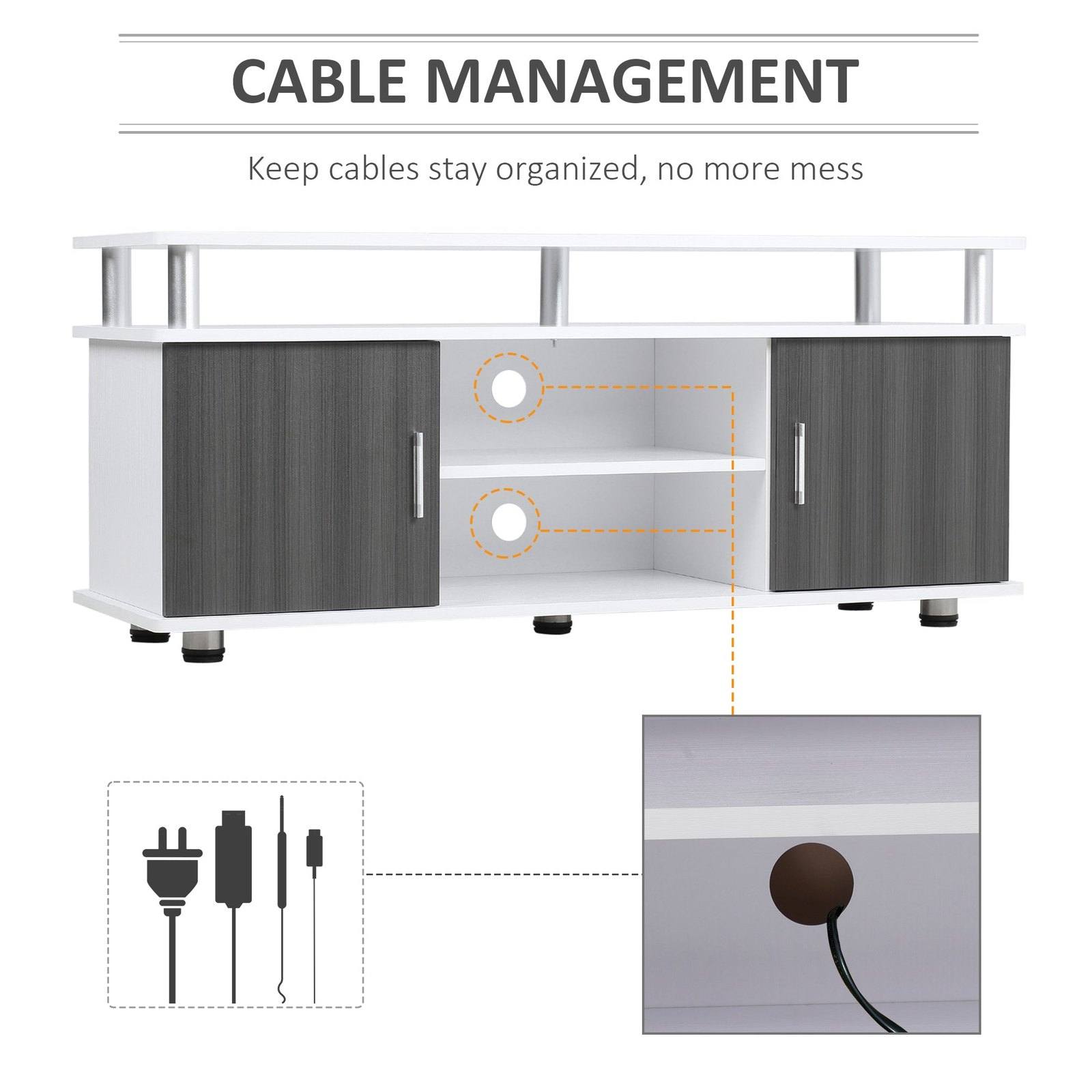 HOMCOM TV Cabinet blends perfectly into your modern, simple lifestyle. It features the large top panel which holds up to 120 cm flat panel TV screen. There are also open display shelves to hold your entertainment equipment and two compartments with doors for your loose stuff such as CDs, DVDs and games. Designed to be lightweight and space-saving. The cable management system helps you maintain a tidy entertainment space.