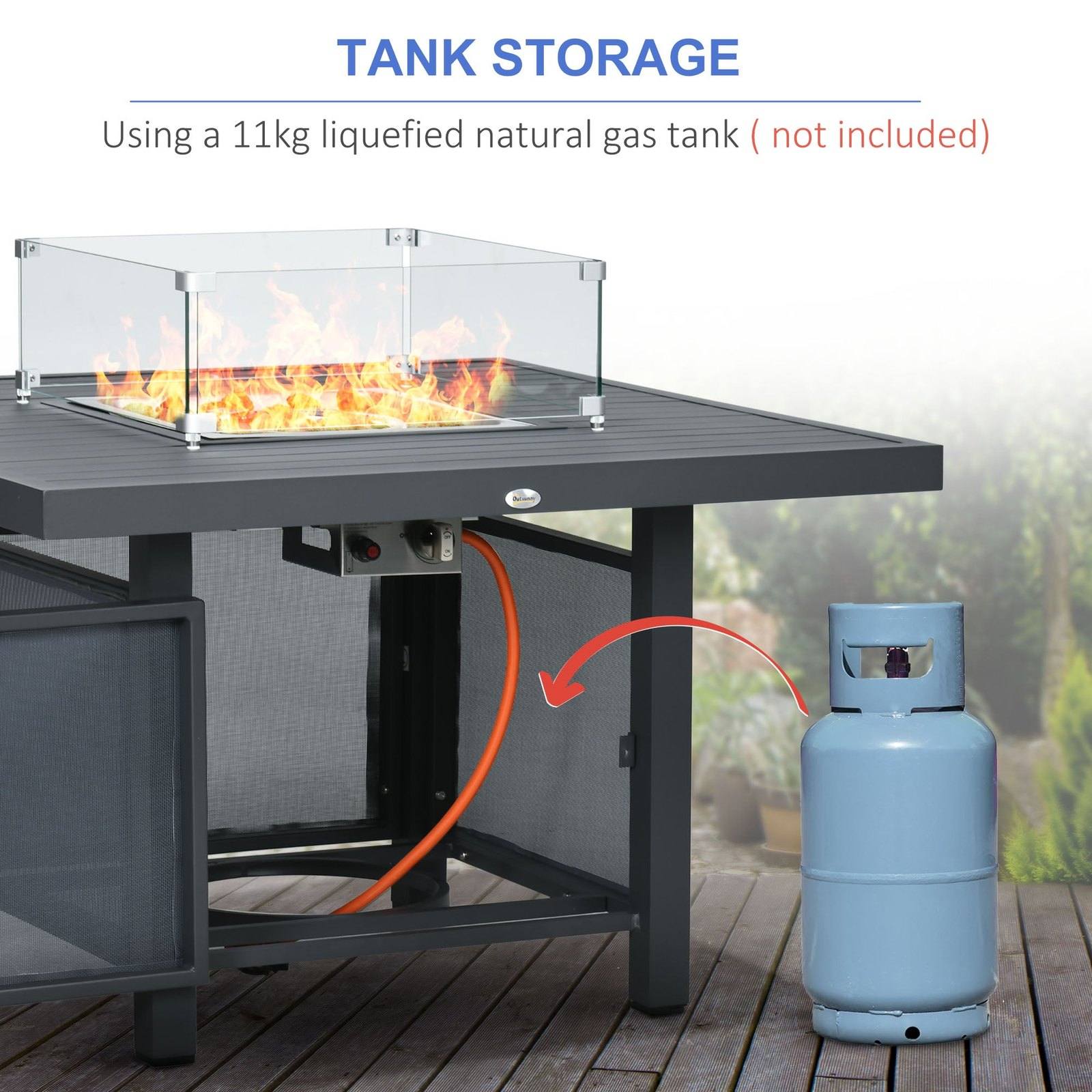 - Fire pit table has up to 50,000 BTU heat output. Works with 11kg gas tank (not included)
