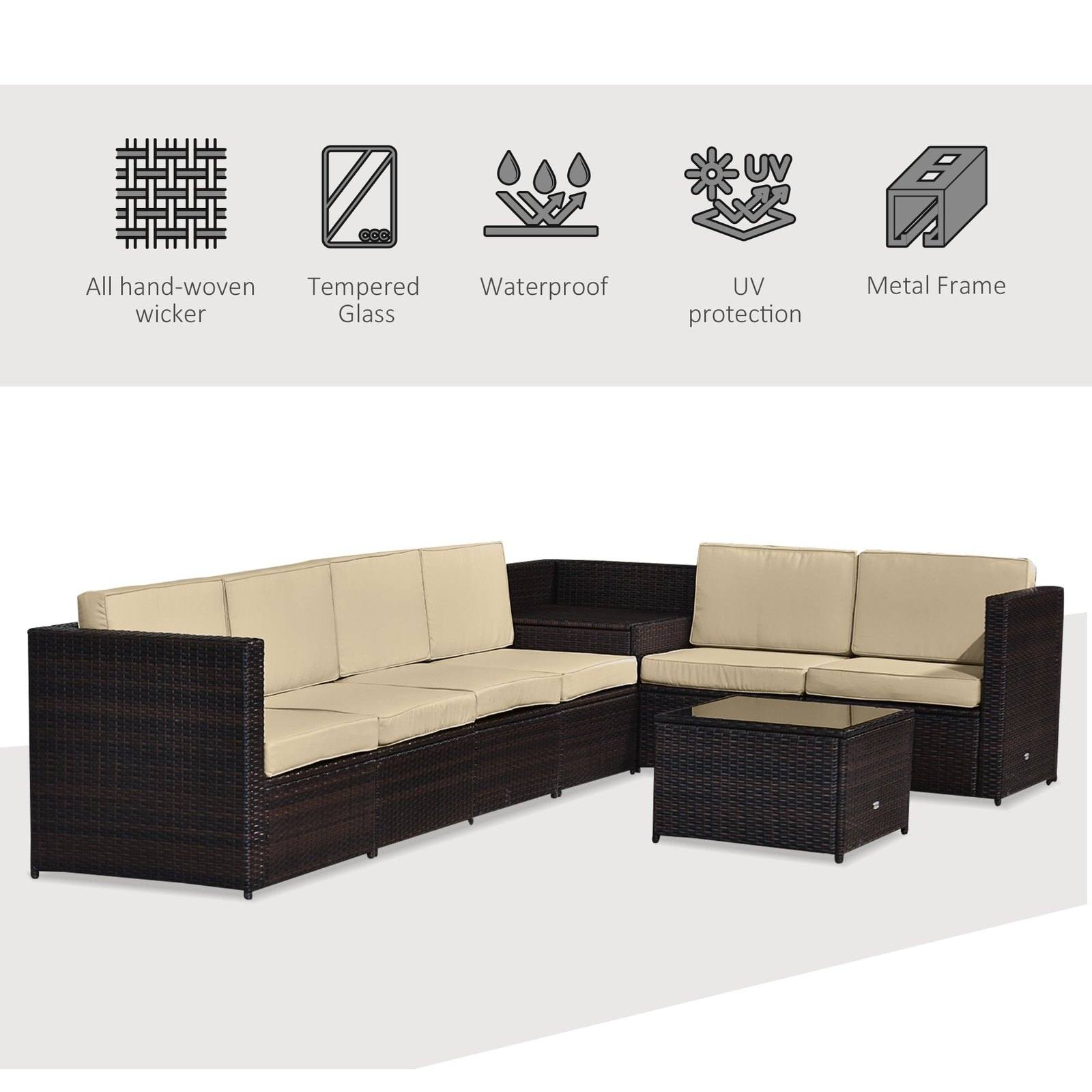 Make the most of the warm weather with this eight-piece garden rattan furniture set from Outsunny. Its open design is also great for combining two or more sets together in your café, restaurant or business to allow you to cater to larger seating numbers and expanding your outside business revenue. Finished with a hidden storage compartment in the corner table, youll never leave the area in a mess, making it ideal for those with busy lifestyles and little time to spare.