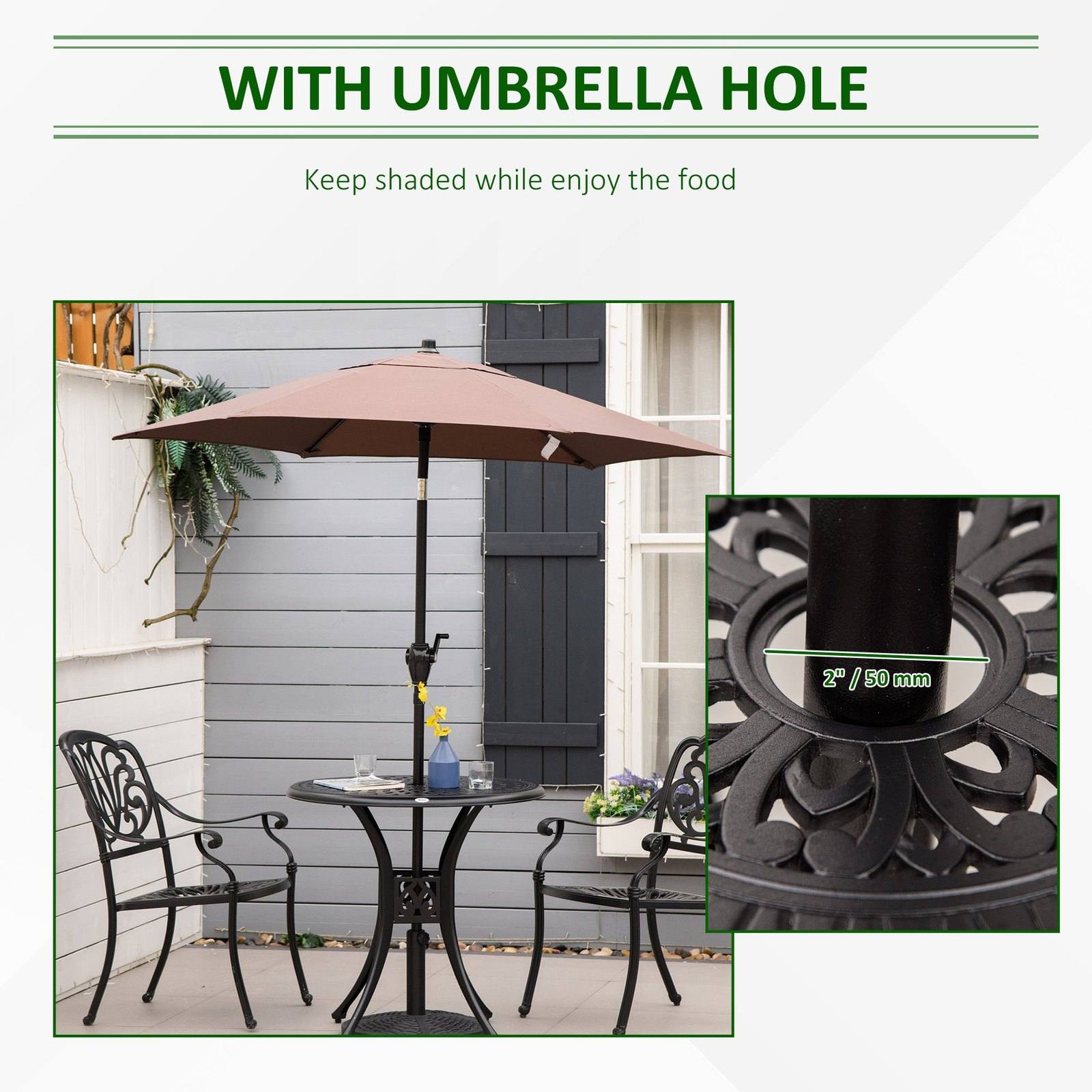 A handy holding spot, which also brings style into your garden and outdoor areas: this round bistro table from Outsunny. Cast aluminium is tough, with a powder coating for extra strength and protection. It's crafted into cut-out design for something a little bit different - perfect for those who like to make an impression. A middle hold is for holding a parasol umbrella to keep you shaded. To complete, pair with bistro chairs so everyone can gather round.