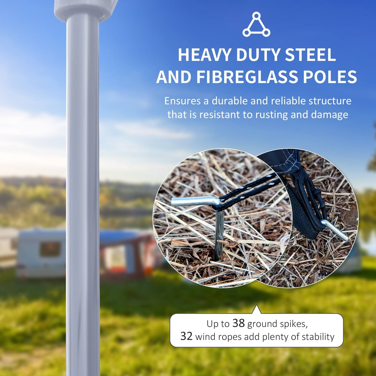- 38 ground stakes, 32 guy ropes and carry bag included