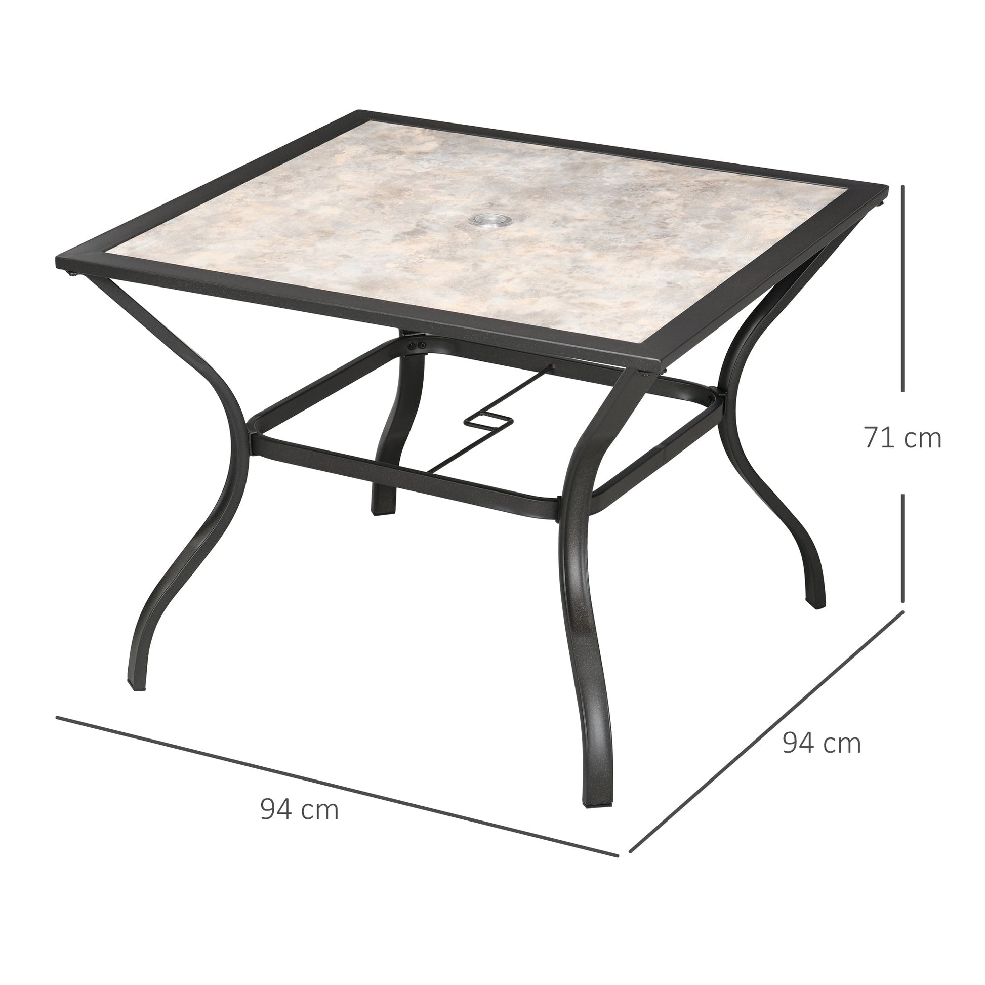 Gather round outdoors with this Outsunny square table. Powder coated steel frame for a strong core, with a easy-clean tabletop for hygiene. The ?38mm middle hole holds an Outsunny parasol umbrella - keep shaded as you relax. A stylish piece, you can use anywhere.