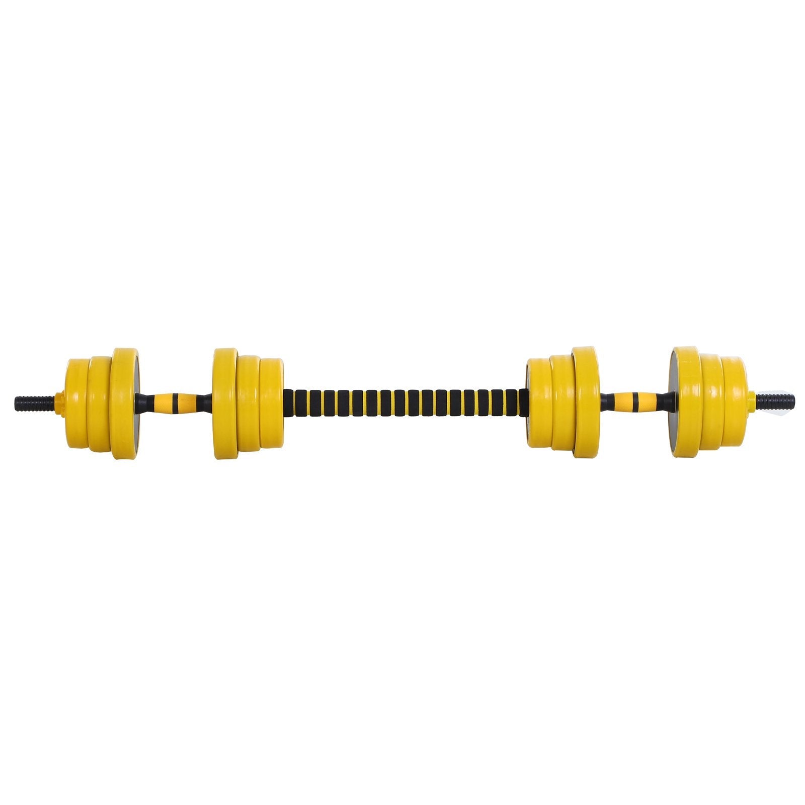 The HOMCOM 20KGS Dumbbell & Barbell is a versatile product, it can help you build your body. Assembly takes just a few seconds, quickly alternate between dumbbell and barbell exercises to focus on muscle strength, endurance, or cardiovascular health. It is very resistant to compression and abrasion, the material of iron sand and Polypropylene ensures the service life of the product.