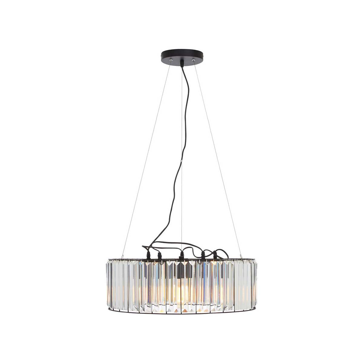 This attention grabbing 5 bulb ceiling light has a ring consisting of a slim black iron frame and glass rods. The bevelled glass rods of the pendant light impart a quality of luxe to any room.