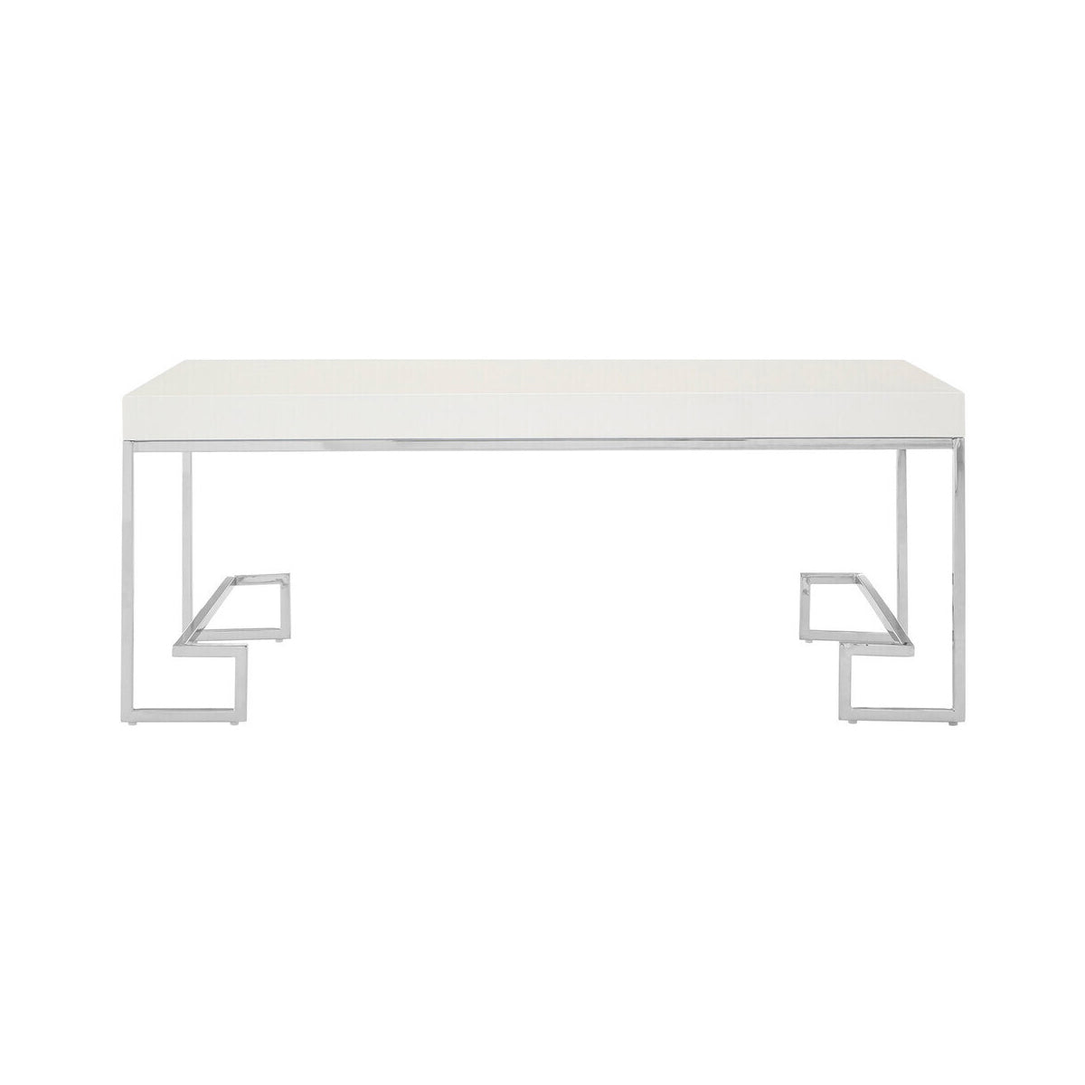 The slim legs of the Allure coffee table are made from sleek stainless steel, with a reverse design at the feet for a symmetrical look. Their polished chrome finish allows this Boutique style table to be counterpointed with warm metallics.