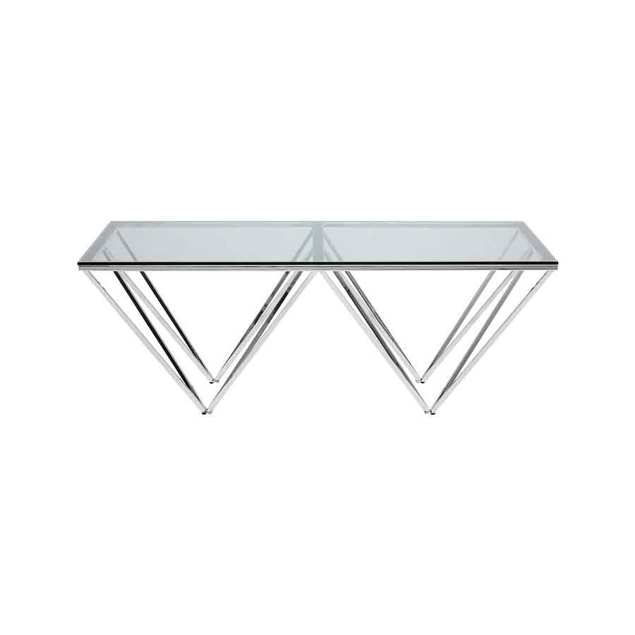 This sleek rectangular coffee table imparts Boutique luxury. The tabletop is made from safe tempered glass, its transparency enabling an uninterrupted view of the distinctive legs beneath.