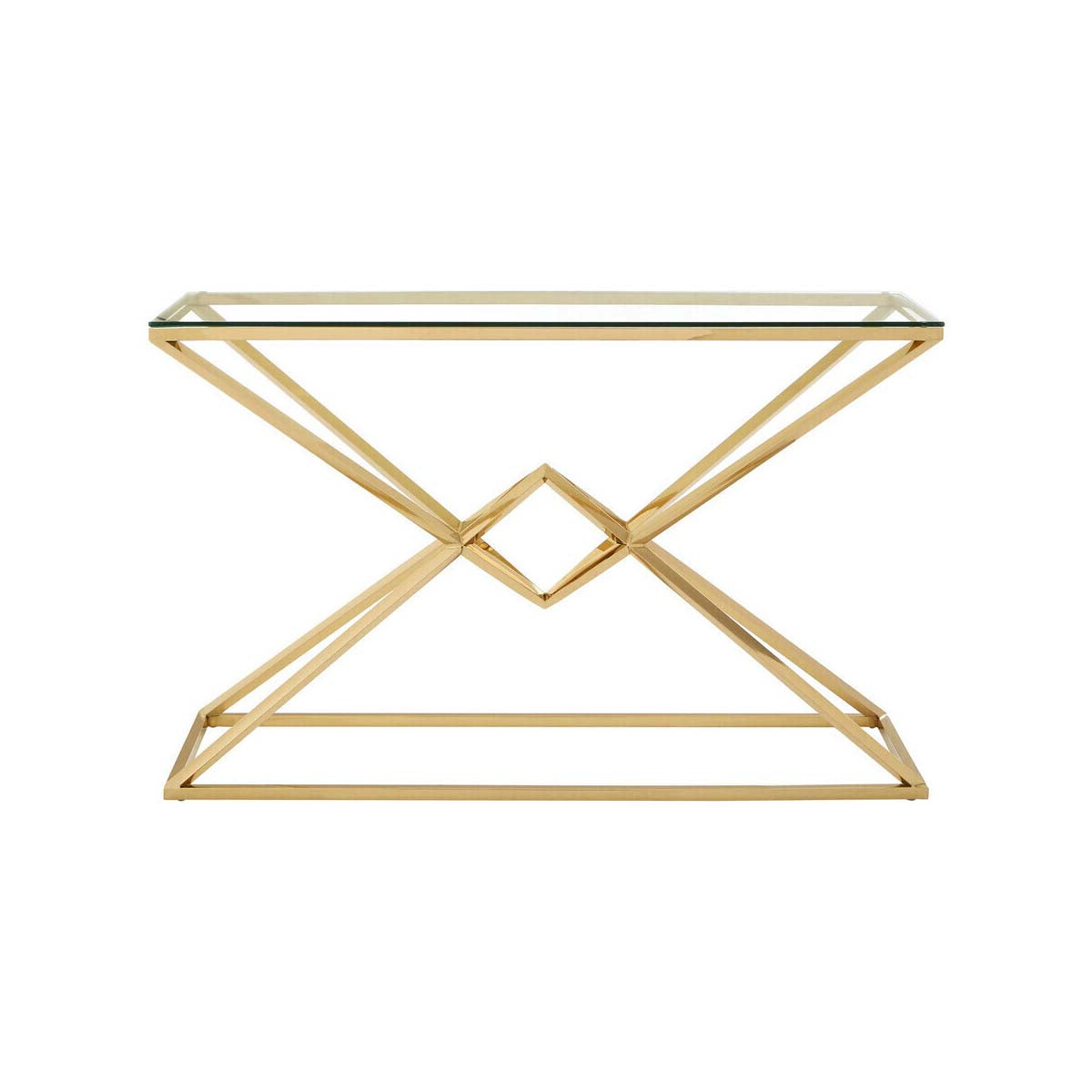 Its base is created from two stainless steel triangles, inverted to create a symmetrical look. Both triangles merge at the tip to create a diamond shape that appears to be suspended in mid-air. The steel has a rich champagne gold colour that complements warm metallic accessories. Display a geometric accent lamp on its clear tempered glass top.