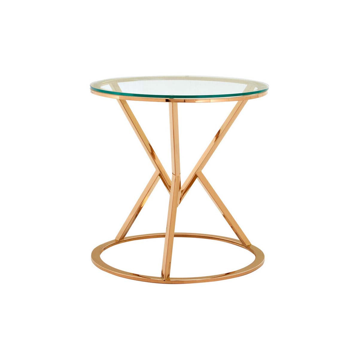 Three lines of rose gold stainless steel descend from the top circle to a pointed finish. A further three lines reach down to the circular base, the symmetry resulting in an angular hourglass shape. The top circle acts as a mount for the clear tempered glass tabletop. Display it with reflective metallic furnishings in a boutique hotel-style interior design setting.