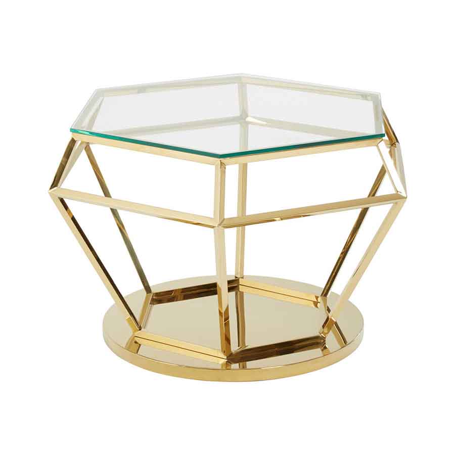 The frame is made from stainless steel and features a rich gold finish that complements warm metallics. An octagonal piece of tempered glass tops this accent piece, and it stands on a smooth round base.
