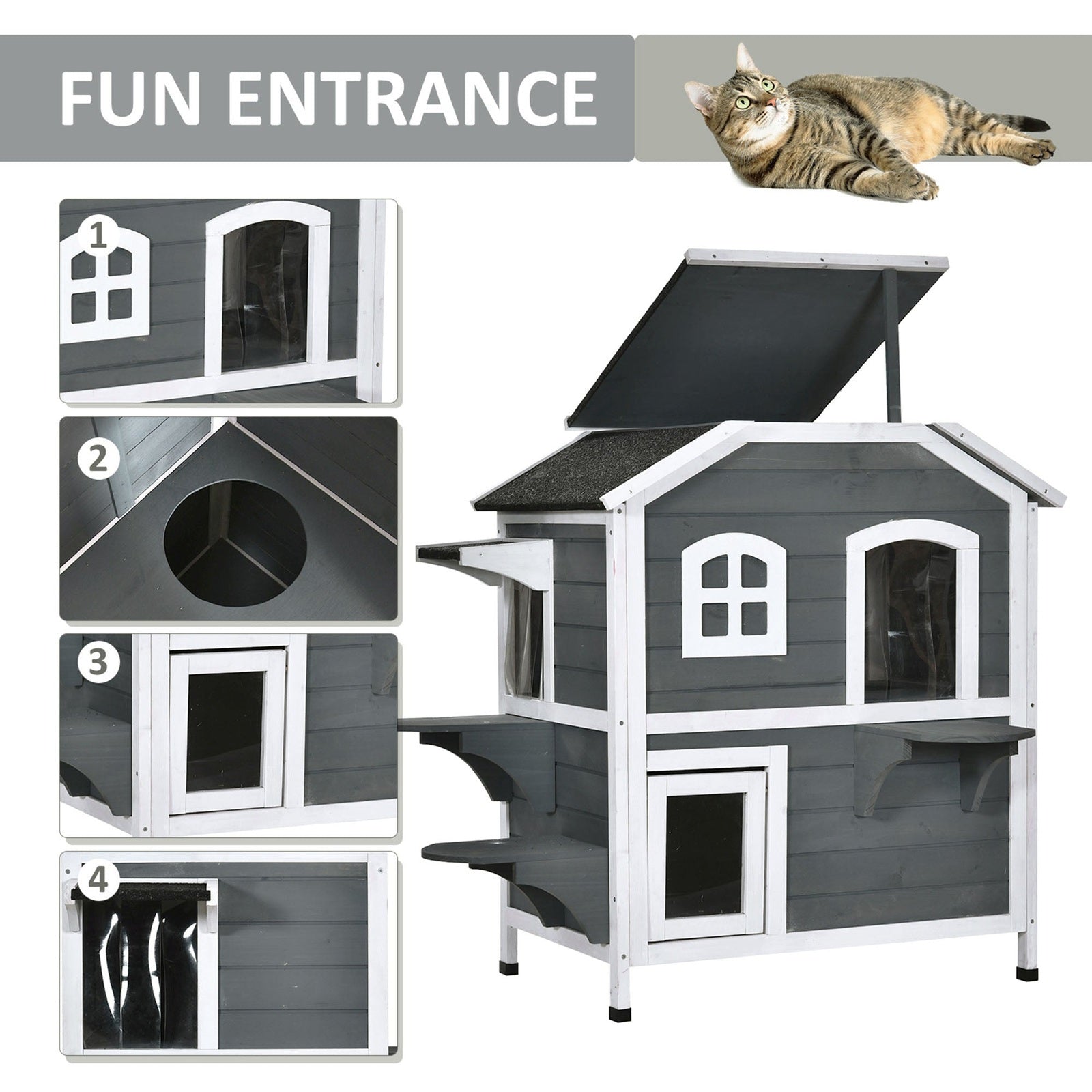 All cats are sure to enjoy this PawHut outdoor cat house. Its asphalt roof and wooden structure is water-resistant suitable for outdoors. There are two levels, providing enough room for two cats to relax comfortably. With three jumping steps, two doors, a floor hole and an escape door, there are plenty of fun ways to get in and out. Finished with an openable roof, making it easy to get in and clean this cat house it also keeps their area ventilated, preventing unpleasant odours from forming.