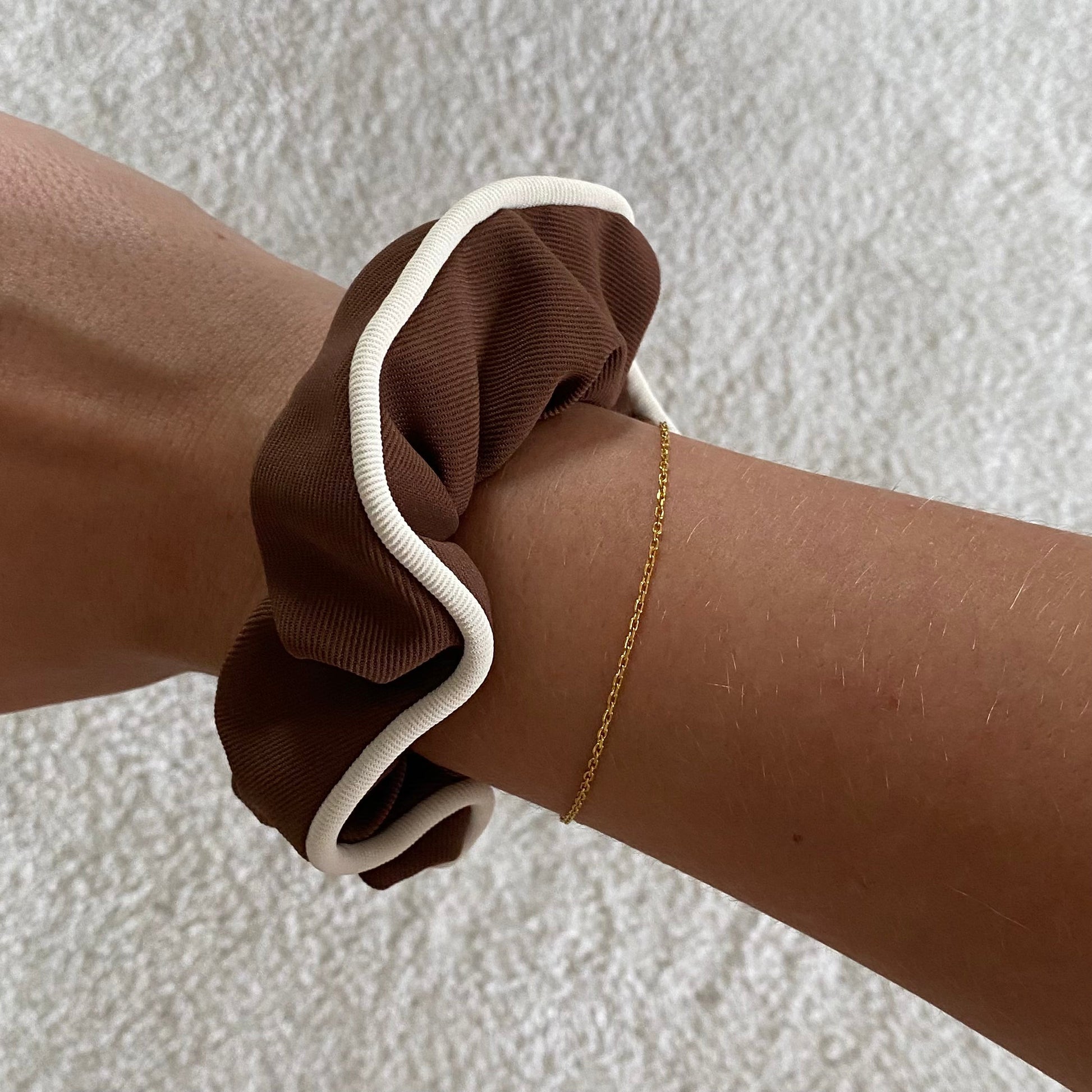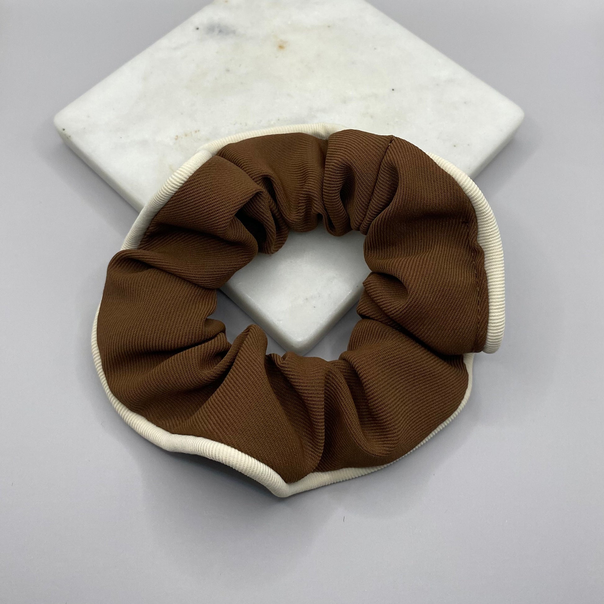An elegant brown scrunchie with a white detailing rim. This is a everyday accessory must-have!