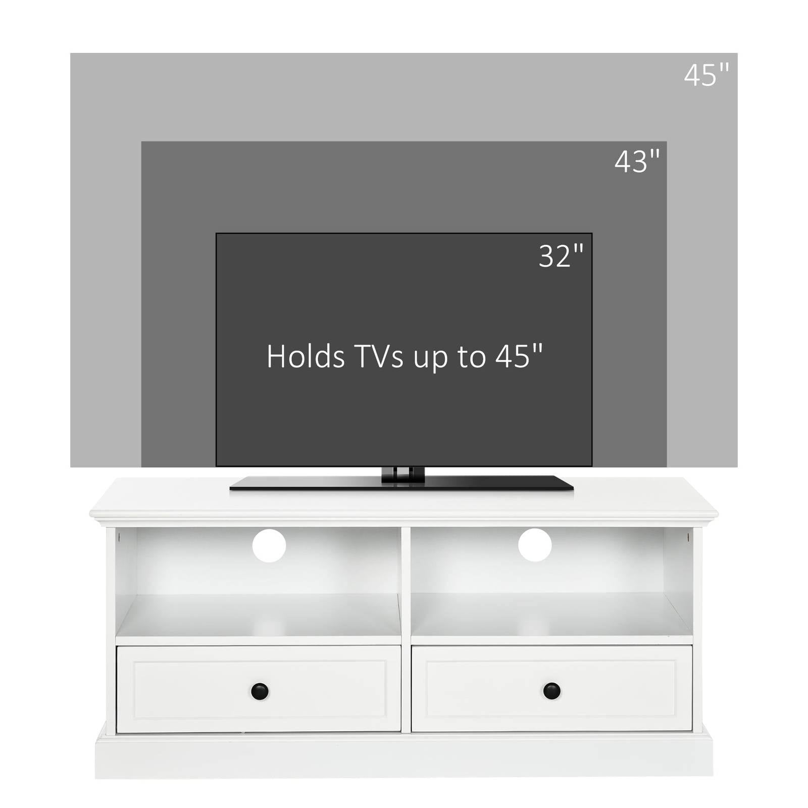Upgrade your living room with this HOMCOM entertainment unit. The pure white colour makes the unit a beautiful focal in bedroom, living room or any other places. 2 drawers and open shelves provide ample storage space. According to your preference and needs, you can use the entertainment stand for keeping game controller, cable box, books and video games. There are 2 cable holes for organizing wires without messy. Without a doubt, it will be a perfect companion for your relaxing moments.