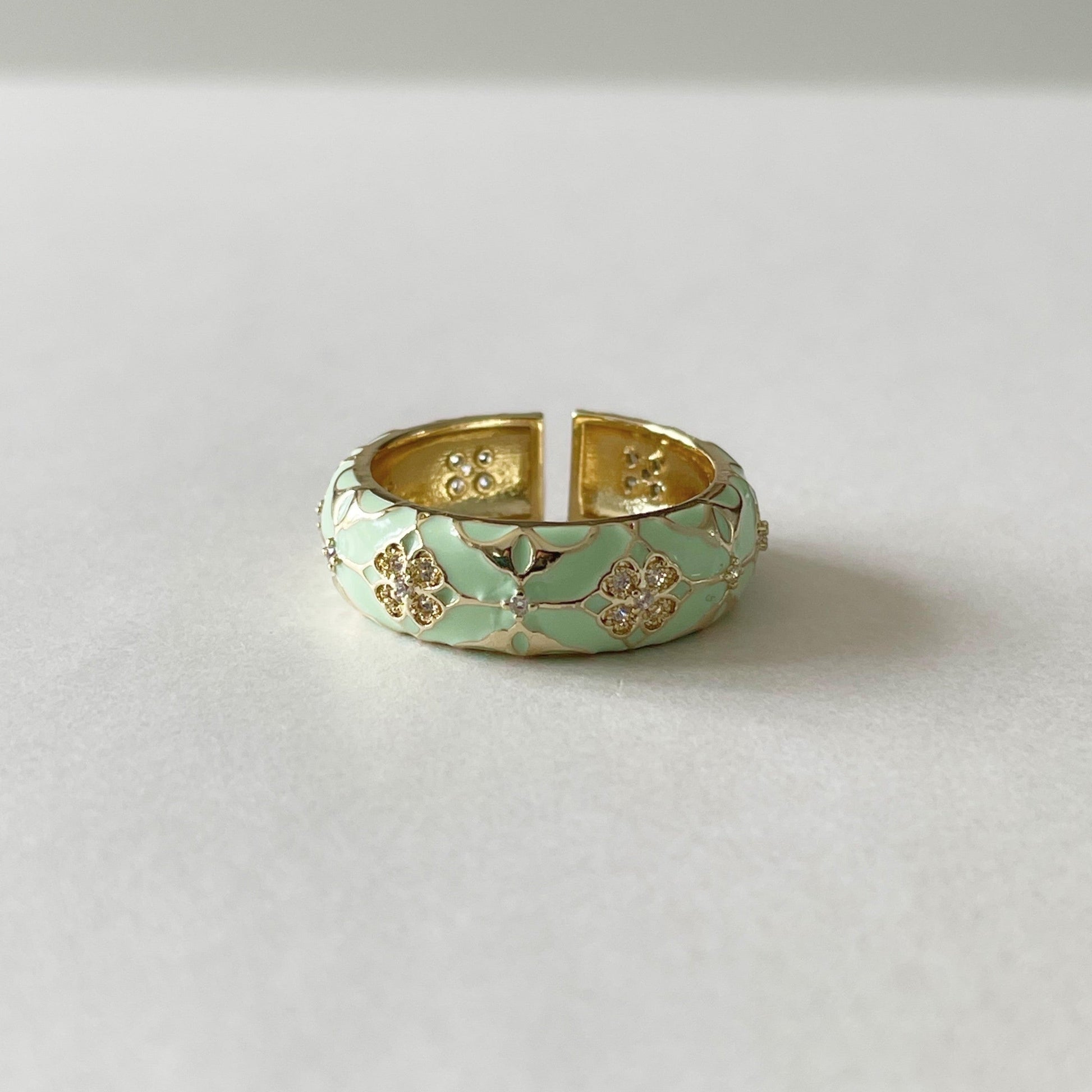 Adorn your finger with the intricately crafted Cleo Mint Jewelled Enamel Ring. With a gorgeous mint green enamel base, this exquisite piece is further accentuated with gold floral details for an elegant flourish.