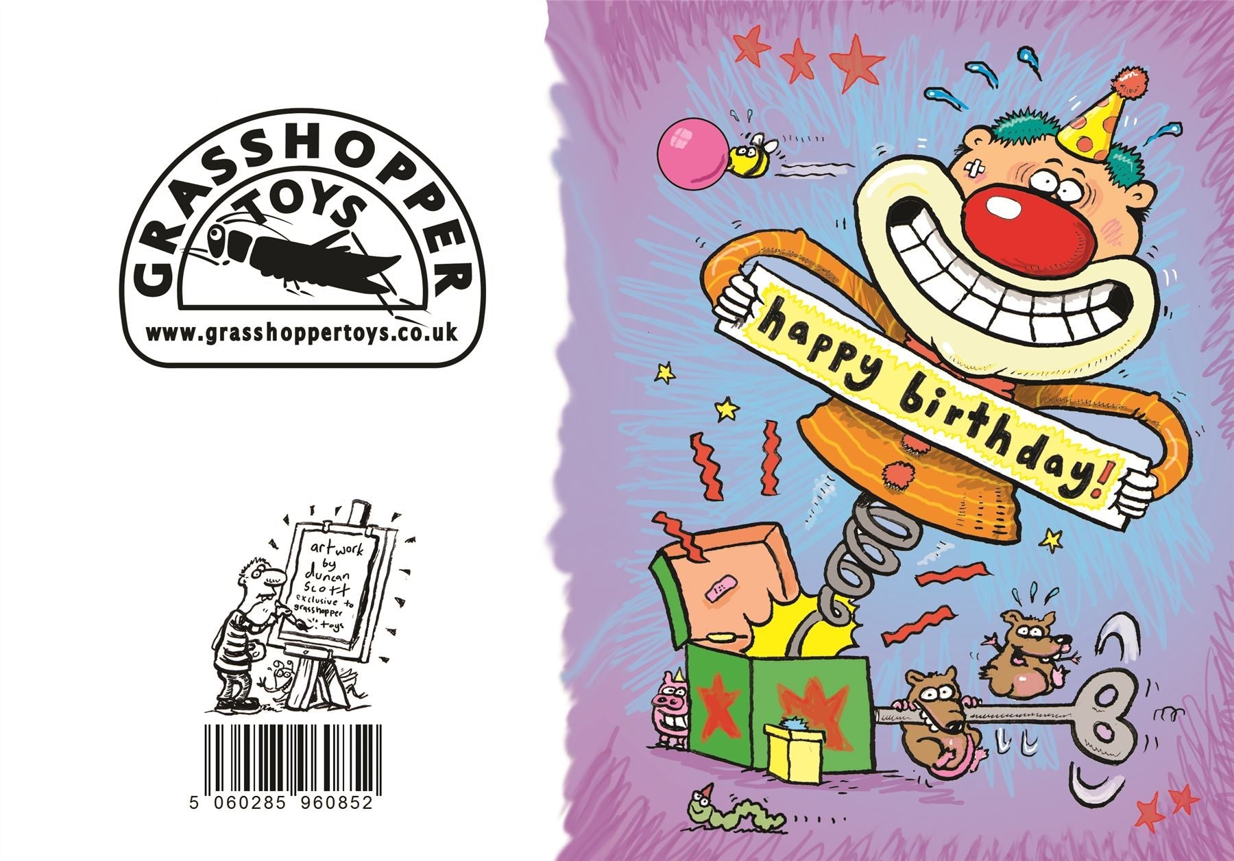 The Clown in the Box children's birthday card was designed for us by Duncan Scott, a talented & respected cartoonist who made his name writing & drawing for The Dandy & The Beano comics.