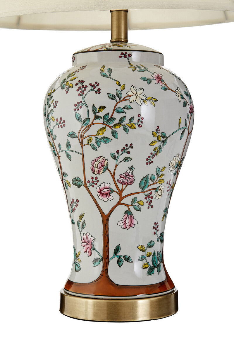 The finial coordinates with the layer of metal that forms the lamp's plinth. The exquisitely decorated base is made from ceramic, with a white finish that provides a clean palette for the ornate foliage and flowers that embellish its smooth surface.