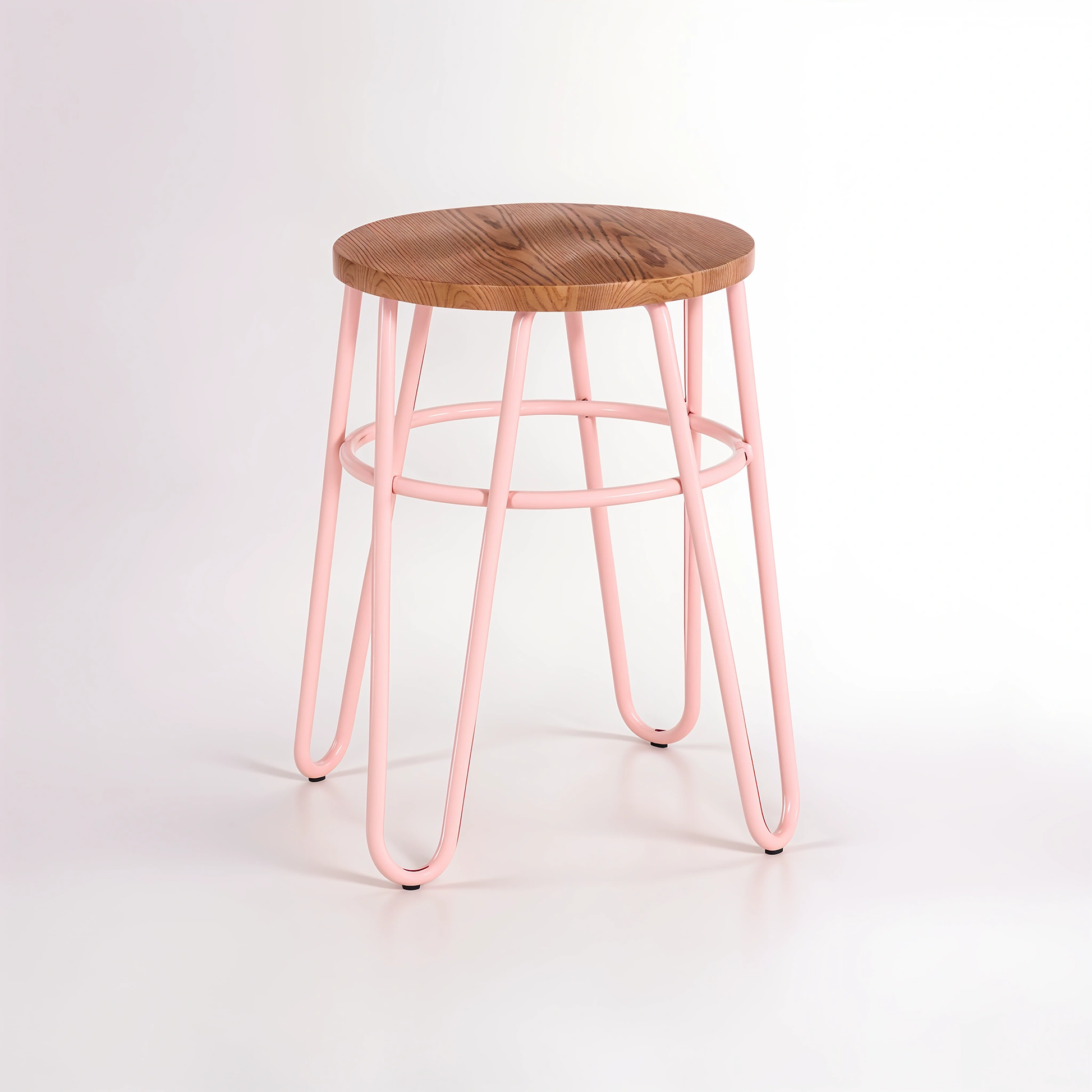 Elm wood forms the seat of this modern stool. This stool offers a comfortable seating experience and is supported by a soft pink-finish metal frame. A circular ring attached under the frame that adds stability to its sleek design and hairpin-style legs. This stool has a minimal profile that makes it a versatile addition in many interior settings.