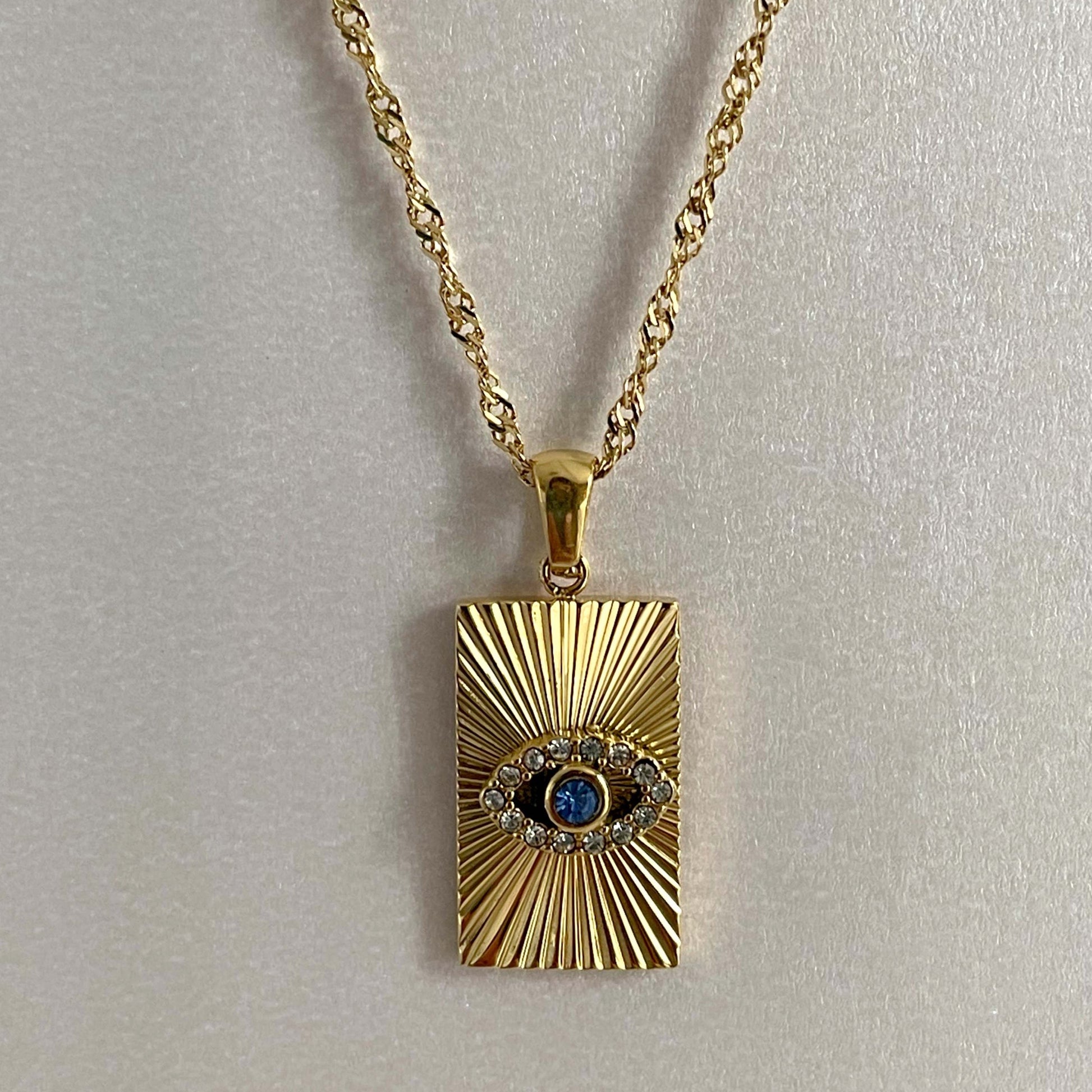 The stunningly bold Domenique necklace features a highly polished gold textured sunburst pendant featuring the ancient evil eye symbol that is said to ward off negative energy.