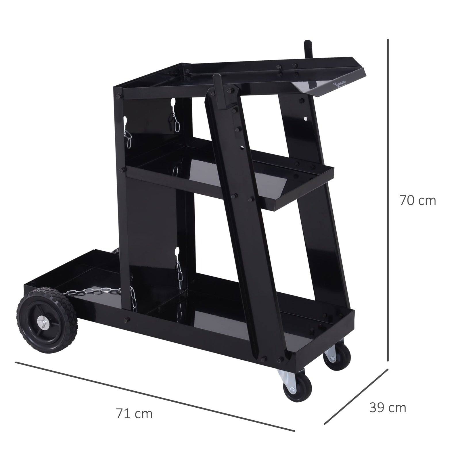 Keep tools organised with this gas bottle trolley from DURHAND. Four wheels at the bottom for easy movement  you'll have your equipment wherever needed, which will be stored on the three shelves. Made from solid steel, the the welding cart can carry up to 50kg of equipment, whilst its slanted surface lets you easily place and use tools.