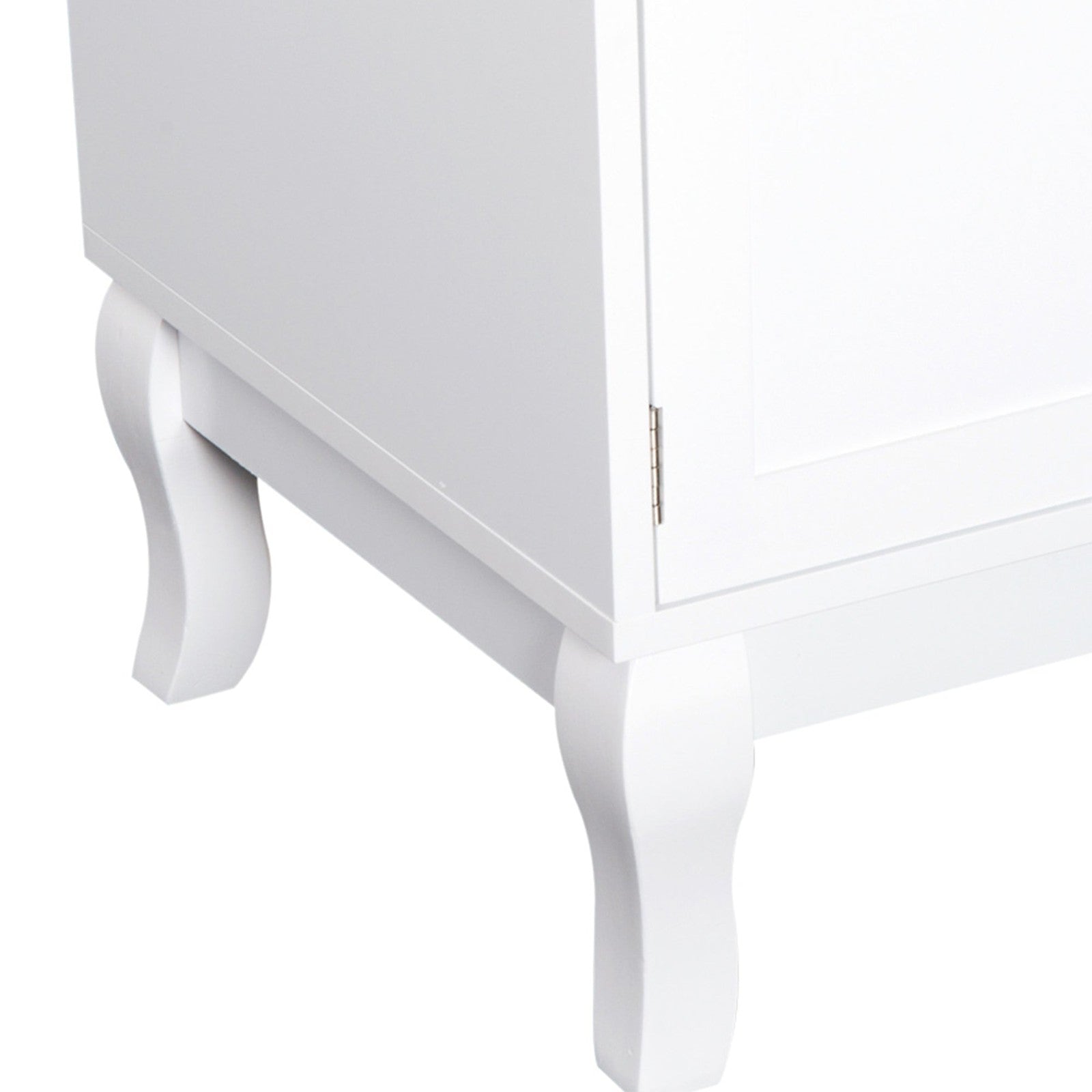 The stylish TV stand from HOMCOM features painted MDF and curved solid pine wooden legs, to create an inviting modern and classical atmosphere and also ensures reliable stability and durability. The smooth materials make it easy to clean with soft cloth. The spacious design with 2 cabinets and 2 open shelves provides ample room for your DVDs, remotes, magazines and other small items. The cabinet doors with handles and stoppers are easy to open and close. You can organize the cables neatly in place, thanks to the hole on the backboard. Add the spacious stylish TV stand to your home and office, creating an ideal entertainment center.