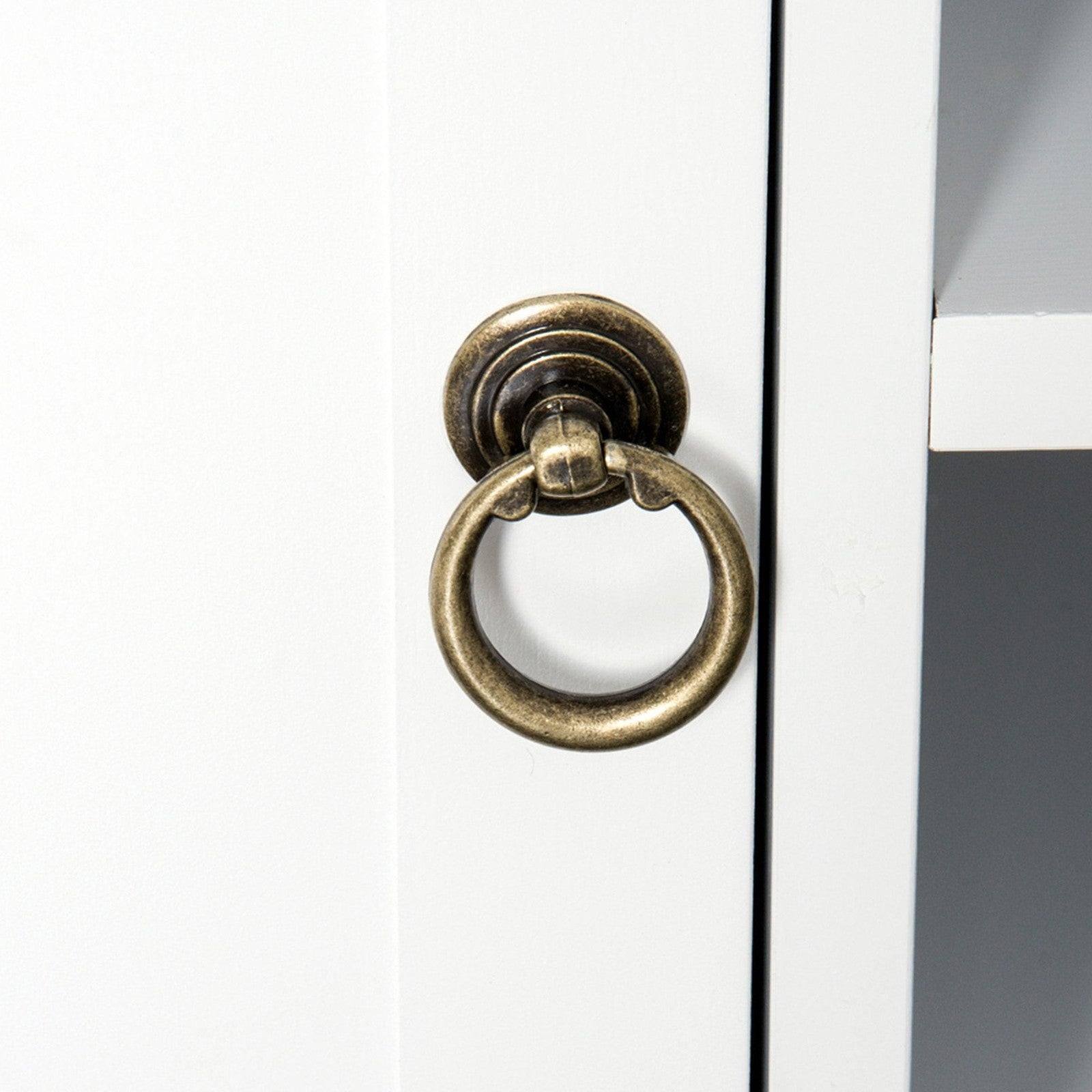 - The cabinet doors with circular metal handles and stoppers are easy to open and close