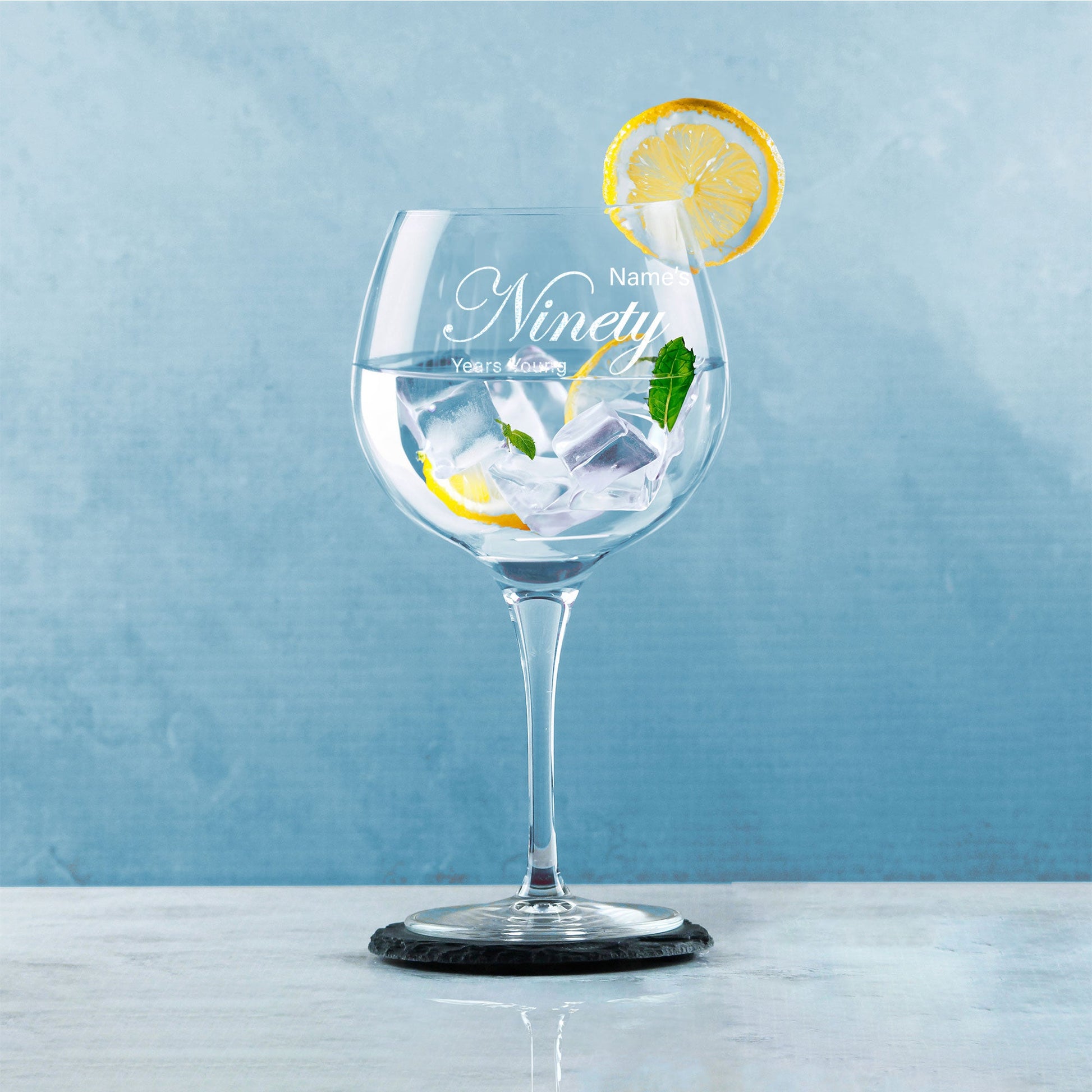 Engraved 90th Birthday Primeur Gin Glass Years Young Curly Font