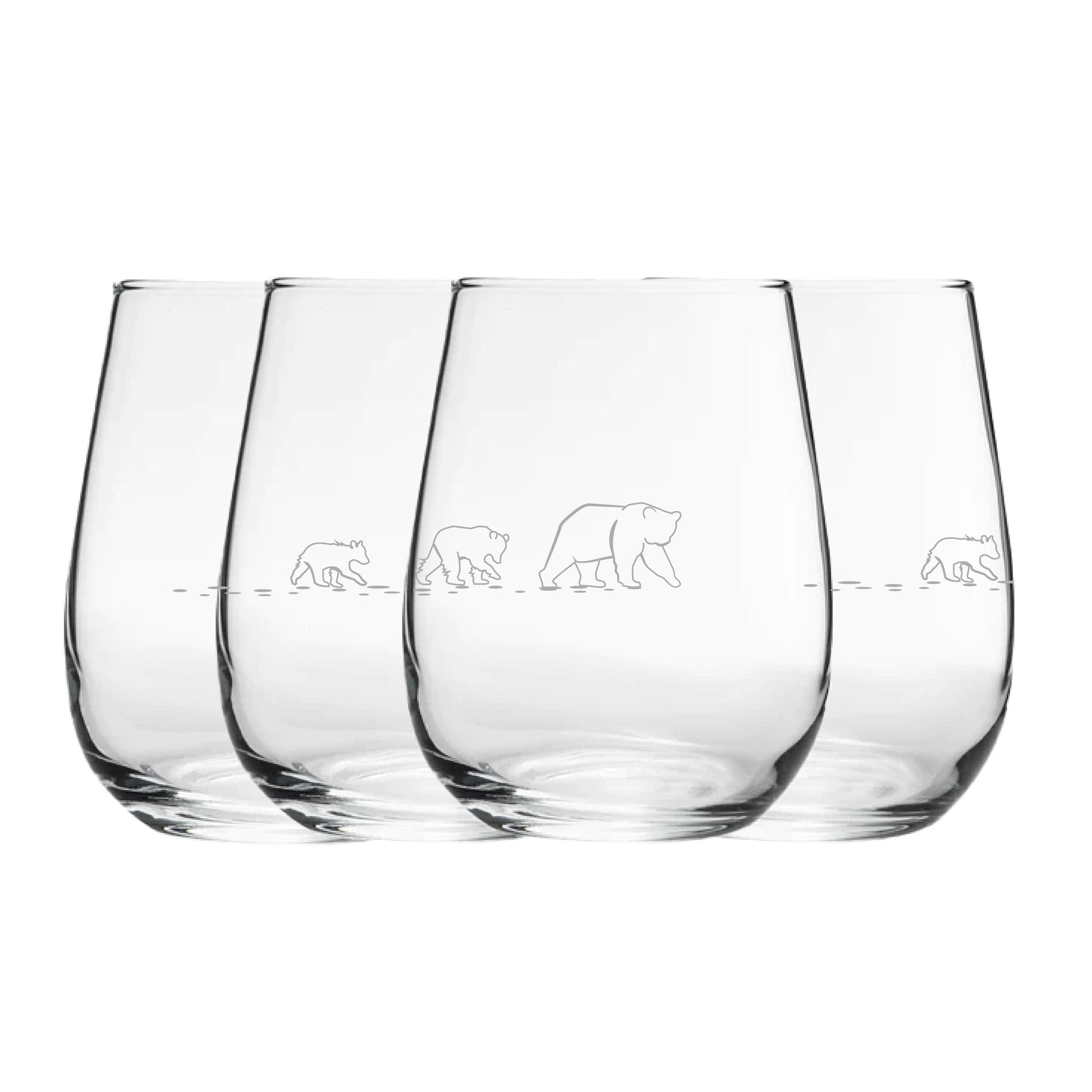 Engraved Bear Pattern Set of 4 Gaia Stemless Wine 12oz Glasses