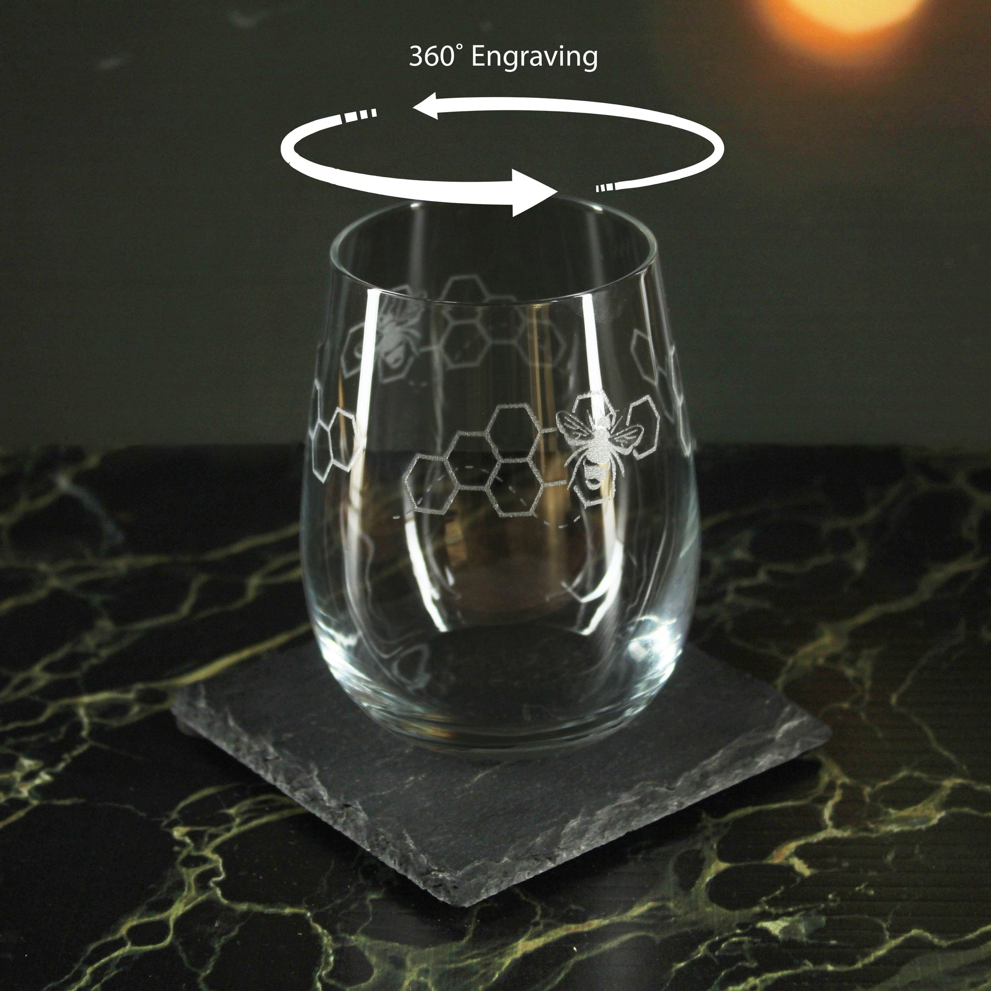 Engraved Bees Pattern Set of 4 Gaia Stemless Wine 12oz Glasses